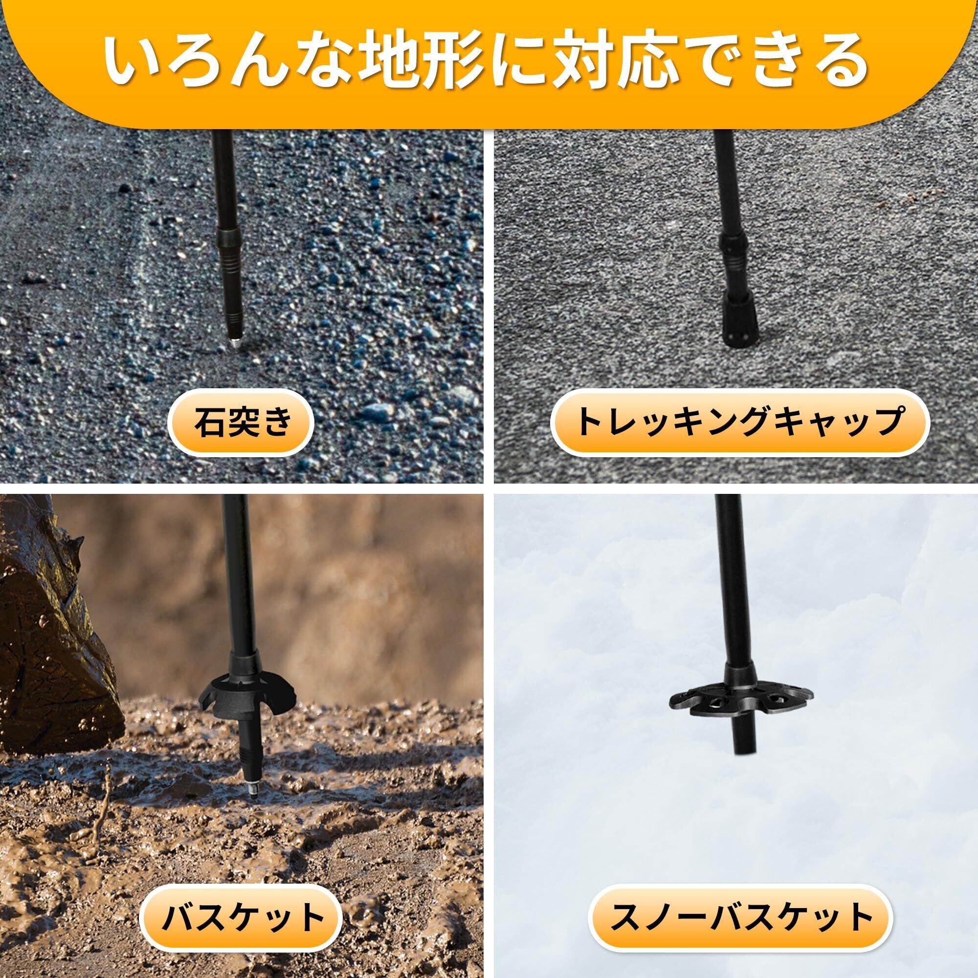 【いろんな地形に対応できる】ポールの石突きに付属品を装着することにより、地面に突いたときの安定感が高いです。また、ポールの石突きにネジ山を設けることでご使用する時にラバーキャップの脱落を防止します。不使用時はポールをリュックに取り付けますと、歩行の邪魔にならず、使いたい時にすぐに取り外せます。