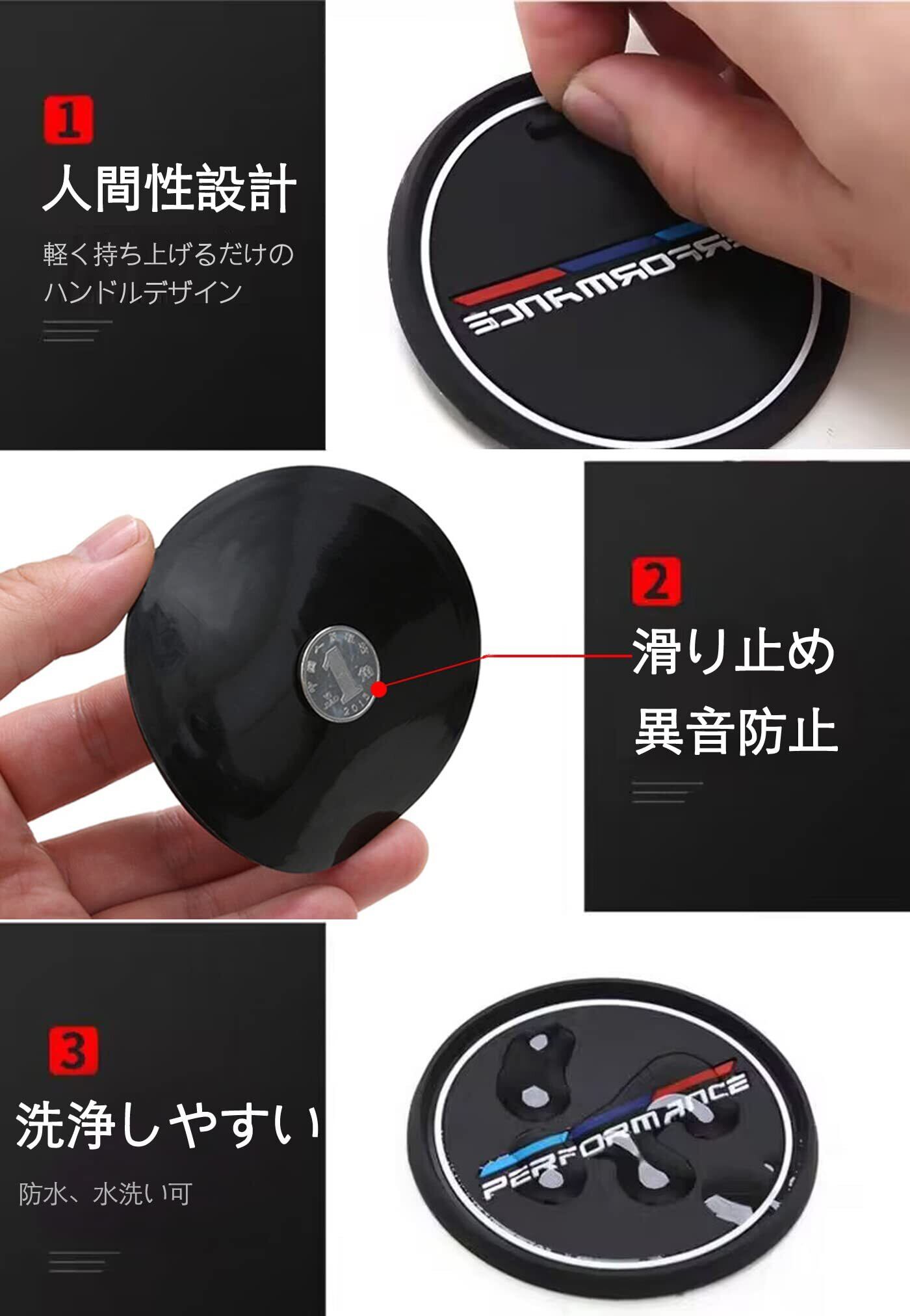 ●【デザイン】専用ロゴで、カスタマイズが好きな車のオーナーにおすすめです。車内の楽しさとスポーティさを高めます。取っ手付きで、カップコースターを持ち上げるのが簡単で便利になっています。発光デザインは強い光の下で光を吸収し、夜間に蛍光効果を生み出します。