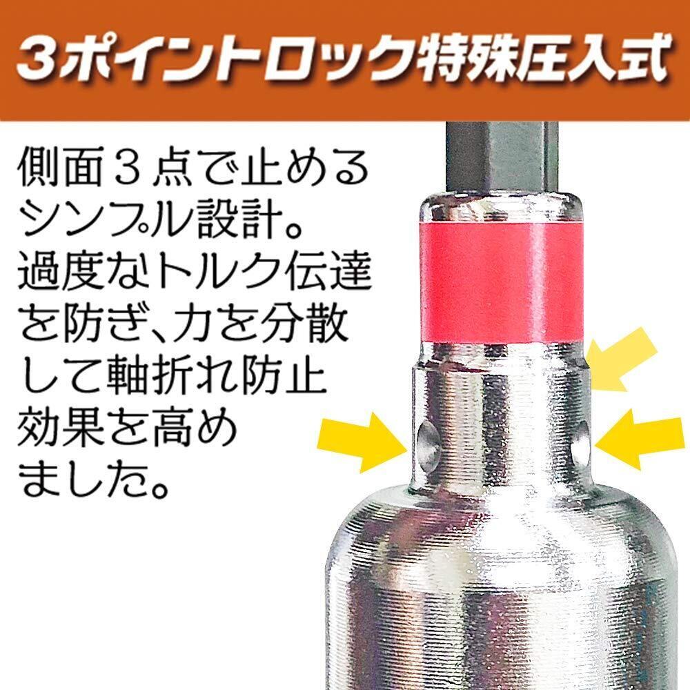 ●ビットとソケットの接合部は3ポイントロックの特殊圧入式を採用。ビットにかかる衝撃を分散し更に軸折れしにくいよう設計しました。