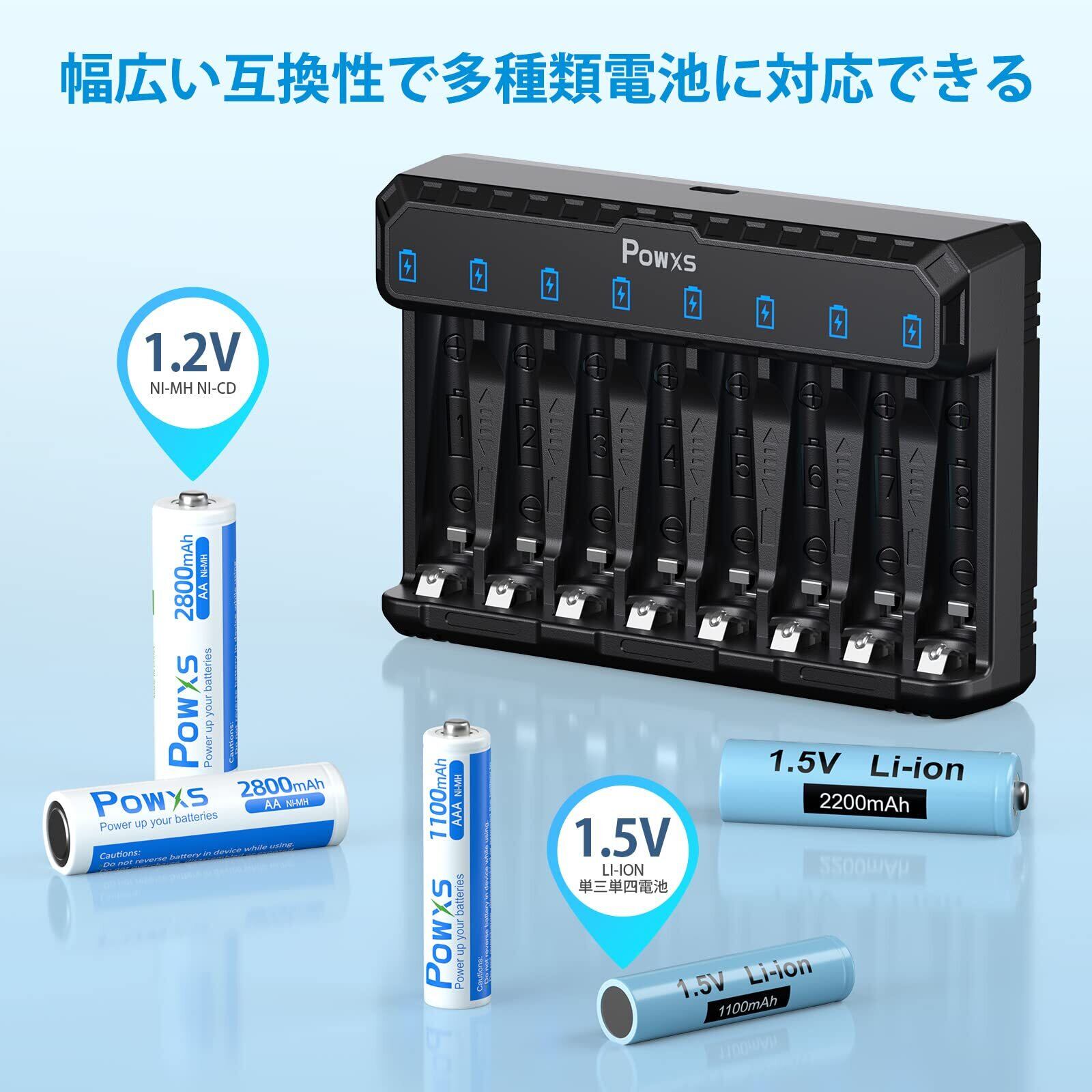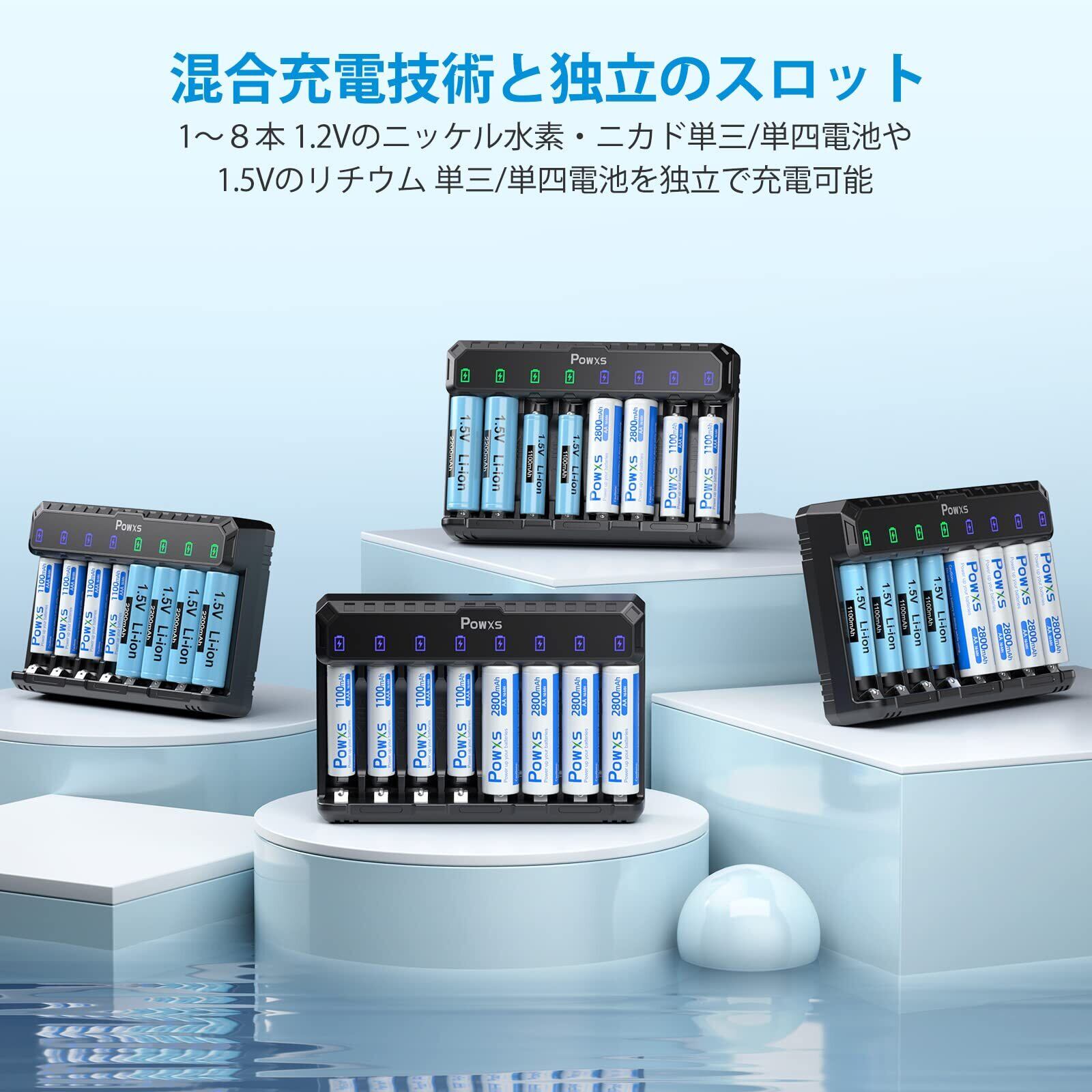 POWXS 急速電池充電器 1.2V ニッケル水素電池/1.5V リチウム電池 単3形・単4形に対応 8スロットで8本同時独立充電可能 LED充電表示 Type-C入力 単三/単四電池 充電器