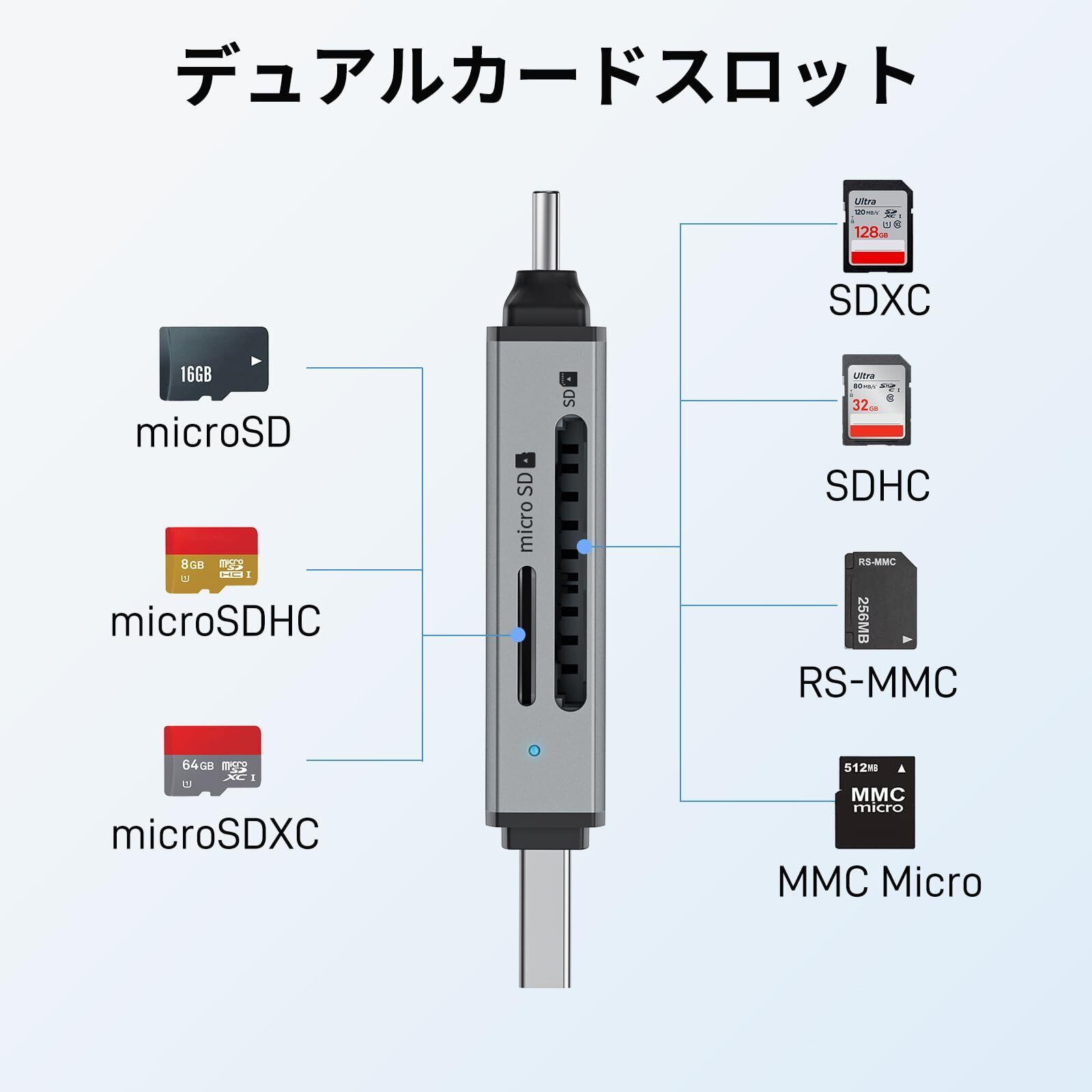 【同時読み書き対応・利便性向上】頻繁なカードの抜き差しを減らすため、デュアルスロット設計を採用したマイクロSDカードリーダーです。microSD、SDXC、SDHC、MMC、RS-MMC、microSDXC、microSDHCなど、最大2TBのメモリーカードを同時に読み書き可能。UHS-I規格に対応し、最大転送速度は104MB/s。【実際の速度はご使用のカードによって異なります。】