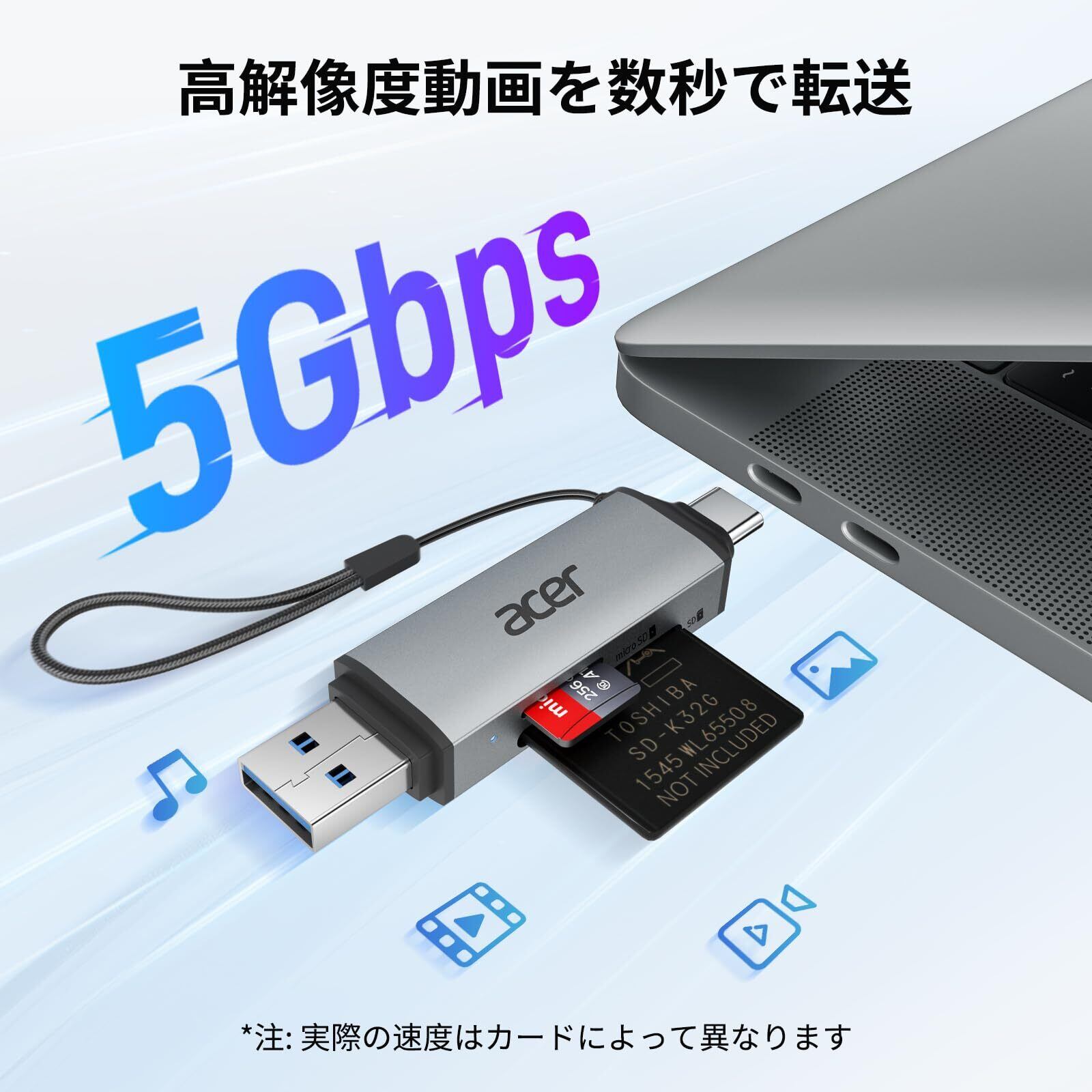 【新春セール】Acer SDカードリーダー【2-in-1】マイクロSDカードリーダー Type-C & USB 3.0 超高速転送 OTG対応 Android タブレット/スマホ/iPhone 16・15シリーズ/ Windows PC/Linux/MacBook/iPad Pro/Chromebook適用 microSD SDXC SDHC MMC RS-MMC対応