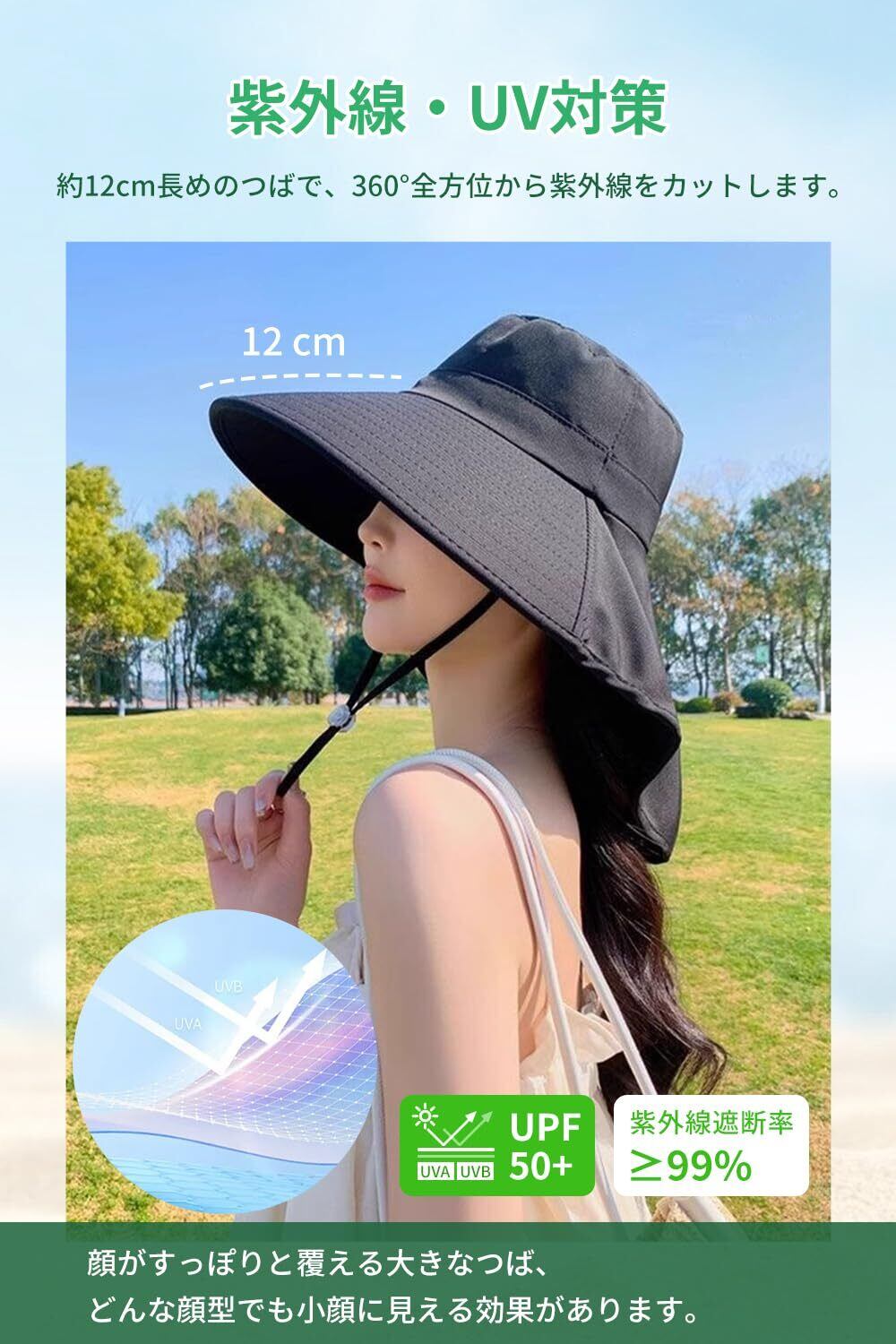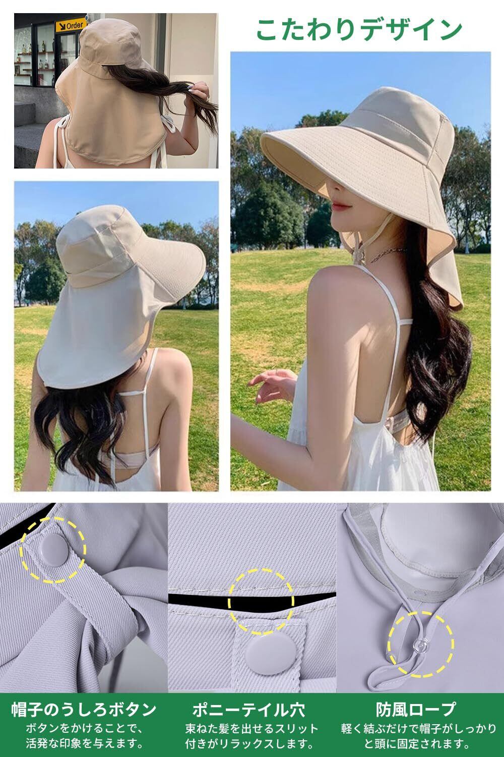 【つば広いデザイン・小顔効果】約12cm長めのつば、すっぽり顔を覆うシルエットで、どんな顔型も小顔になれます。後ろつばは約22cm、顔だけではなく、首筋までも紫外線に対策する。また、帽子の後ろ部分をボタンでまとめられるので、リボンのように使えます。被るだけで女性らしい可愛い雰囲気があふれます。ポニーテールを出す可能なので、レディース帽子を長時間の着用しても頭への負担になりません。