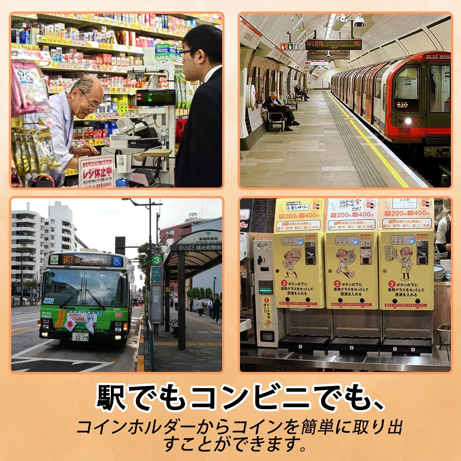 ◎財布代わりにもなるスリムでおしゃれなコインキャッチャー◎ 片手で小銭を取り出せるのが便利な、コンパクトサイズのコインホルダーです。 特殊なコインストッパーが付けられていて小銭の飛び出しをしっかりと防いでくれるので、バッグの中から取り出すときも小銭が落下することはありません。 1円玉から500円玉まで6種類の小銭を収納できるため、大人だけでなくお金を持ち始めた小さな子供にもおすすめです。