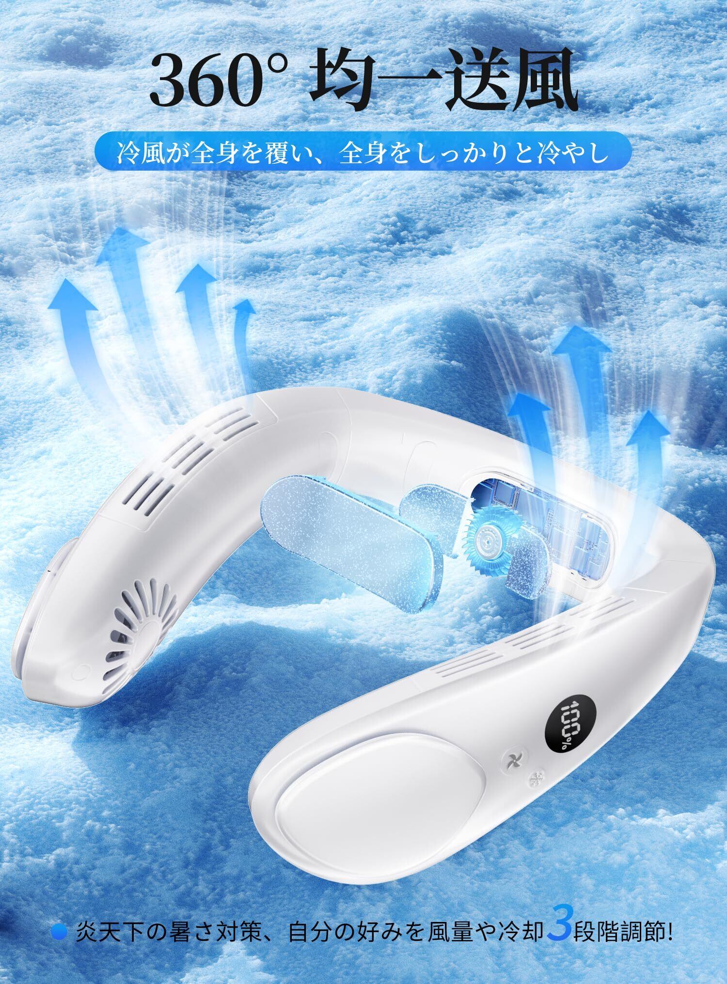 【新春セール】「夏革新型·首掛け扇風機」ネッククーラー ネックファン 携帯扇風機 小型 3段階風力調節 冷却プレート搭載 20dB静音 超軽量 羽根なし モバイル 強力 大風量 LEDディスプレイ表示 4400mAh大容量 長時間稼働 Type-C充電式 熱中症対策 花火大会/通勤通学/アウトドア/夏キャンプ/プレゼントなど(ホワイト)