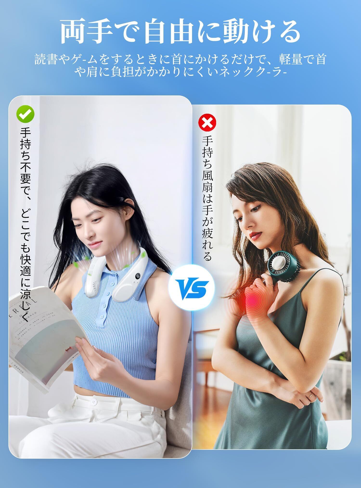 【首掛け設計で負担ゼロ・両手解放】わずか350gの軽量設計で、人間工学に基づいた曲線が首や肩への負担を軽減。ネックファン調整可能な弾性アームで、男女問わずあらゆる体型にフィット。羽根なし設計で髪の毛が巻き込まれる心配もなく、両手を自由に使えるため、キッチン、オフィス、スポーツ、アウトドアなど多様なシーンで活躍します。