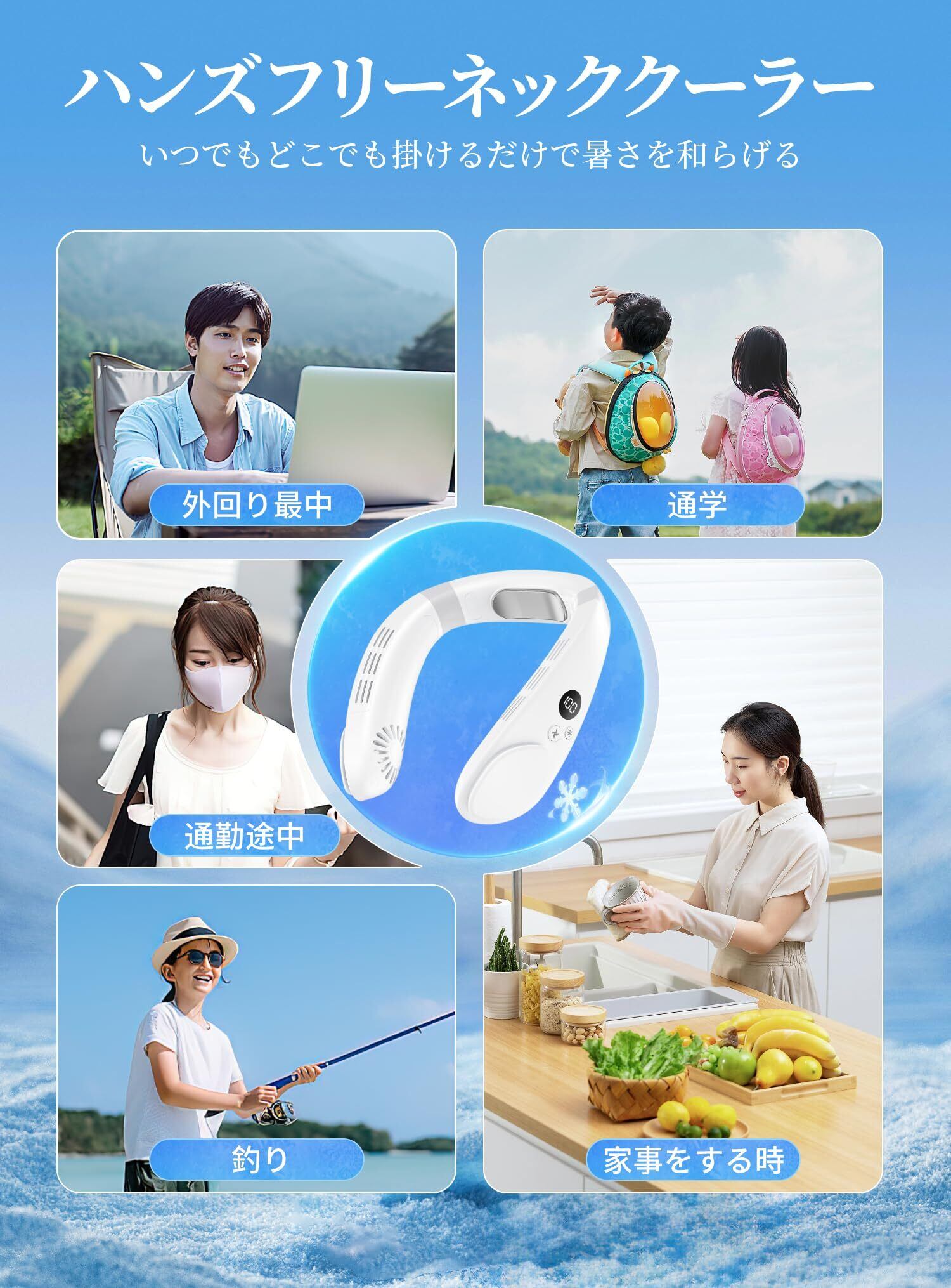 【革新版・夏のネッククーラー】最先端のペルチェ素子を搭載した冷却プレートと、3段階の送風機能を完備。タービン集風技術を採用し、従来の扇風機より98%以上強力な風力を実現しました。首元から全身にかけて瞬時に強力な冷感を届け、体感温度は最大-16℃まで低下。NTC知能技術により、安定した冷却効果を一日中持続します。屋内外どちらでも使用可能で、暑い夏の外出や仕事中も快適さを提供。これ一つで、夏の暑さを軽々と乗り越えましょう!