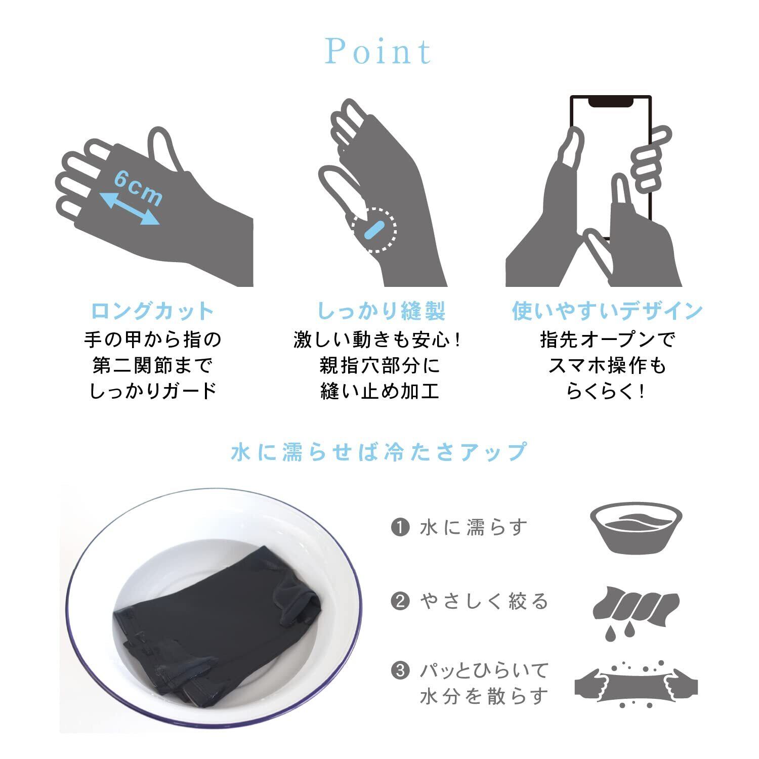●指先がロングカットデザインで、手の甲から指の第二関節まで日差しからしっかりガード。
