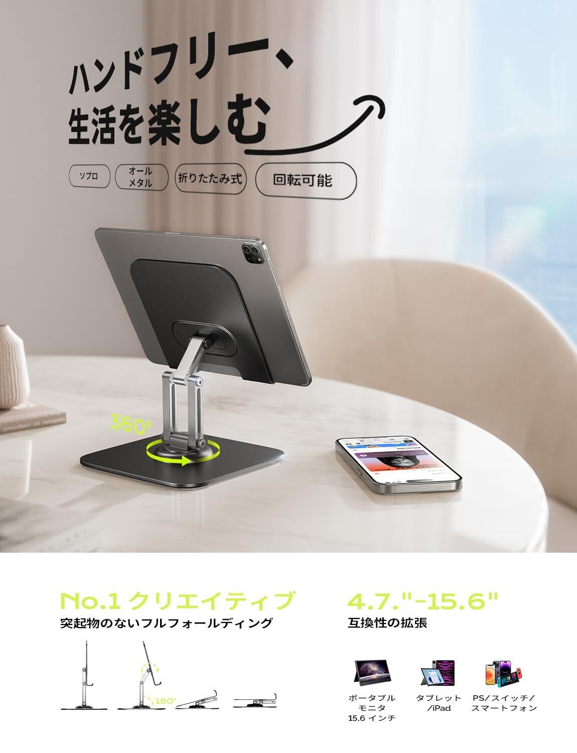 4.7インチから15.6インチまでのiPad、タブレット、モニターに対応するこのスタンドは、iPad Pro 12.9、iPad Air、iPad mini、Samsung Galaxy Tab、Surface、Surface Pro、Kindle Fire HD、携帯用モニターやデッサン用タブレットなど、幅広いデバイスに完璧にマッチします。ビデオ会議、映画鑑賞、オンライン学習など、さまざまなシーンで両手を自由に使える快適さを提供。あらゆるデバイスをサポートするこのホルダーで、もっと便利で楽しいデジタルライフ。
