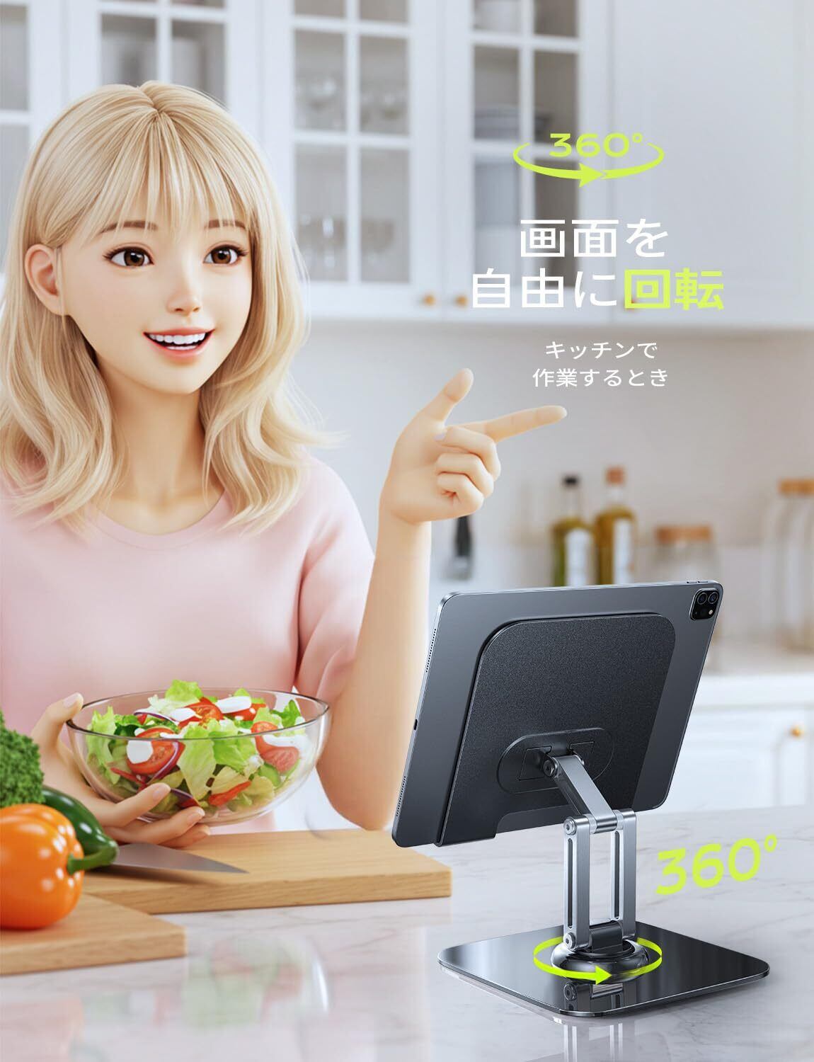 360°回転&角度高さ調節:新たに360度回転をサポートするようにアップグレードされ、iPadホルダースタンドを任意の角度に簡単に調整することができます。さらに、2つの調整可能なモードを組み合わせることで、ビデオ通話、読書、映画鑑賞、ライブストリーミングなど、座る位置や立つ位置に応じて適切な高さや角度に調整することができ、調整可能なタブレットスタンドは最も快適な使用体験を提供します。