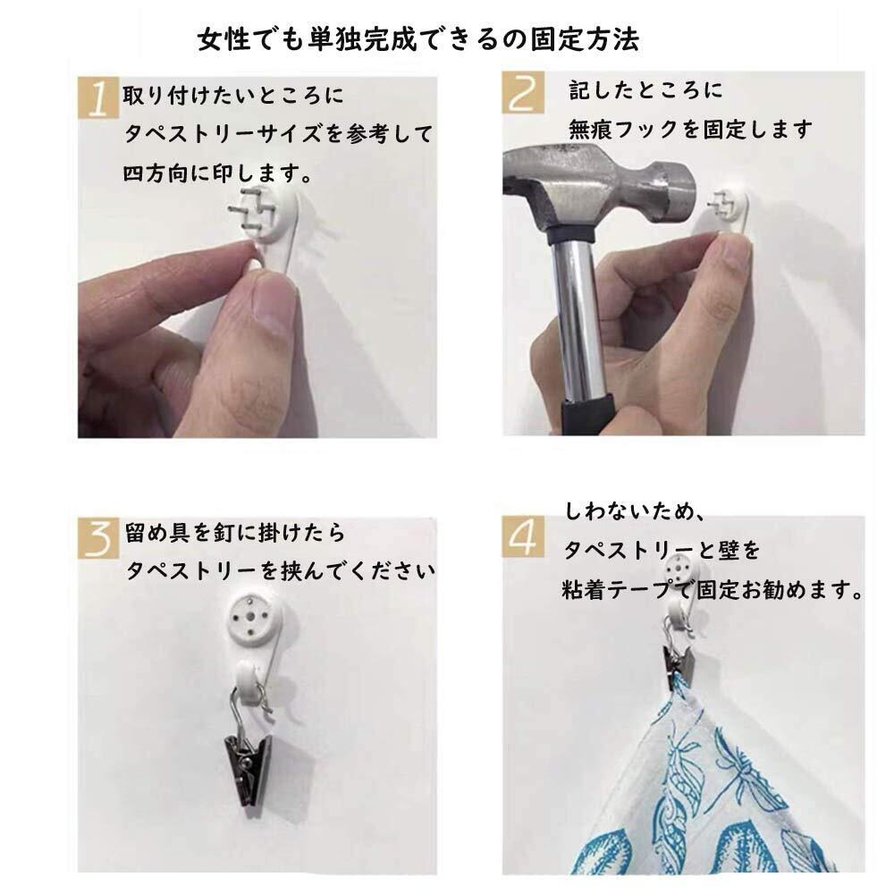 【固定簡単、メンテナンスも簡単】女性でも単独完成できるの固定方法。まず、お好きなところに無痕フックを固定して、留め具が釘に掛けたら、タペストリーの下に粘着テープで少し固定する、取り付けが完了です。お手入れ方法は普通タイプの衣服のように穏やかな周期で手洗いや洗濯機で洗ってください。冷たい水で中性洗剤を使用してください。強くこすったり、鋭利なものや日光を避けたりしないでください。