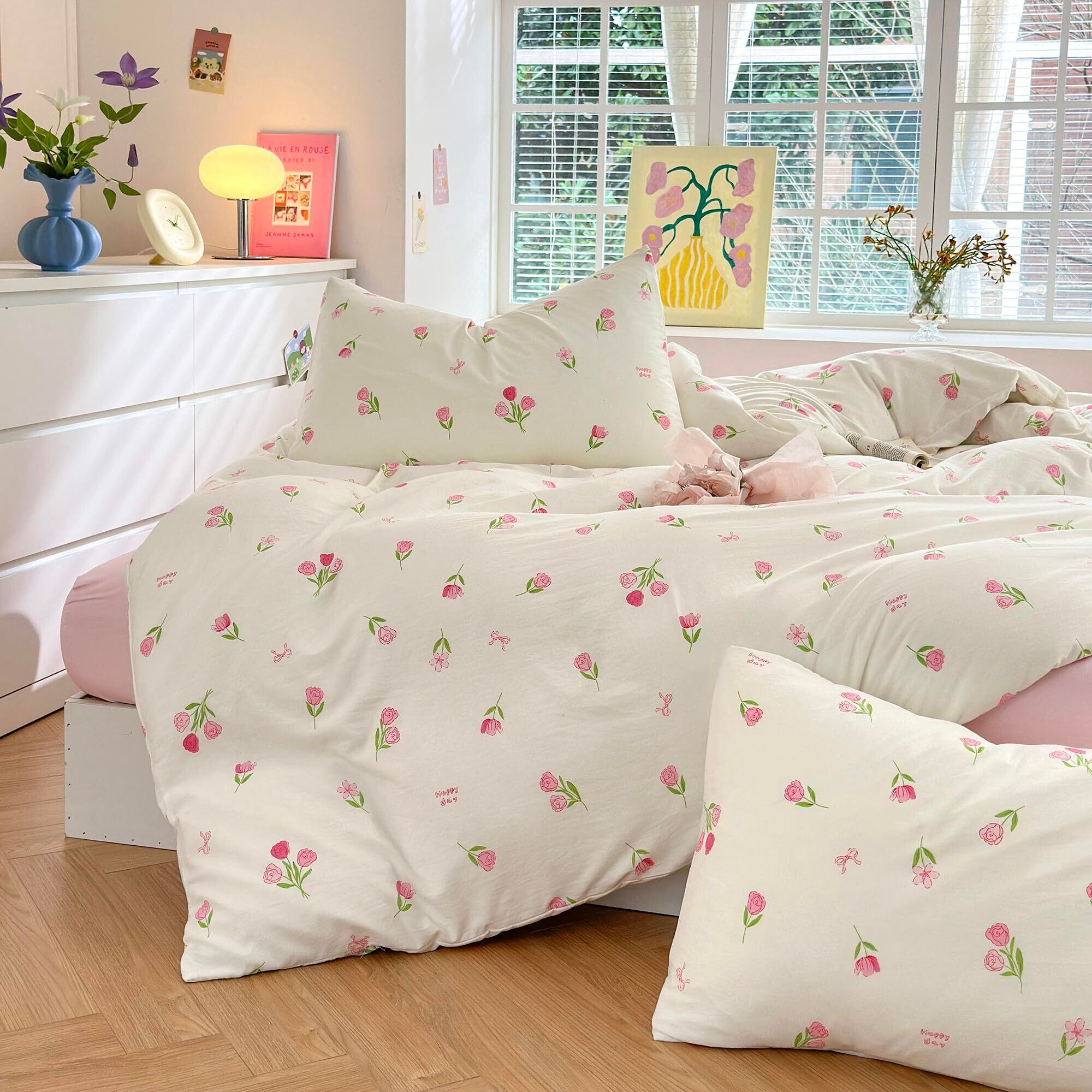 BUKAROOM 布団カバー 4点セット ダブル 寝具カバーセット ダブルジッパー 掛け布団カバー 190x210cm 枕カバー2枚 ボックスシーツ 柔らかい 通気性 四季通用 (バラ ダブル・4点セット)