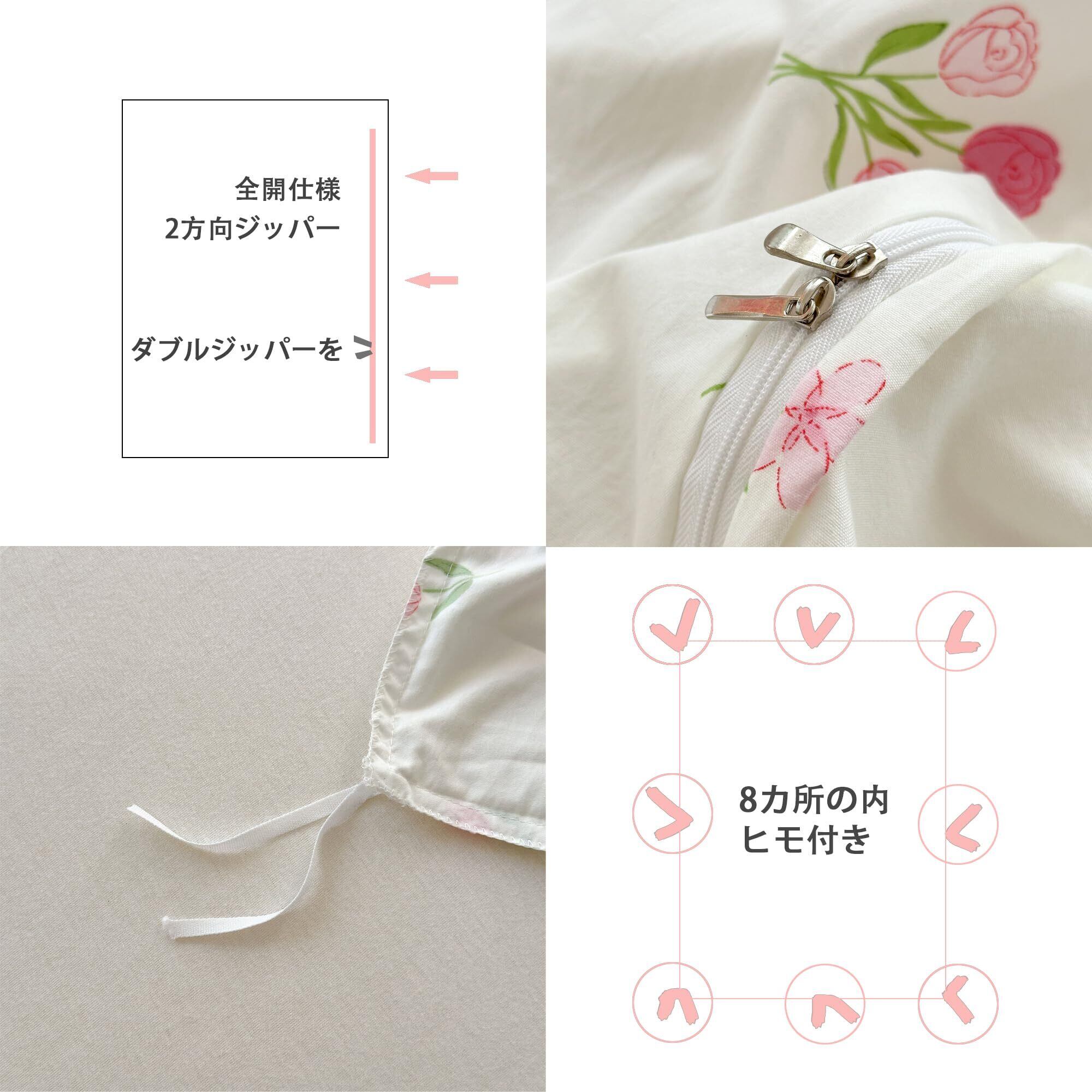心を込めた設計:掛けふとんカバー:片側200cmダブルジッパー付き、8ヶ所ヒモ付き ボックスシーツ:全周ゴム仕様 ピロケース:封筒式
