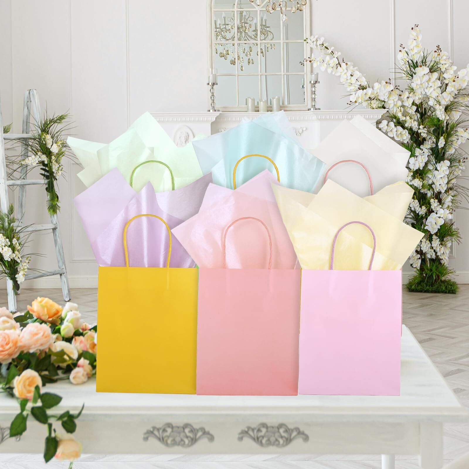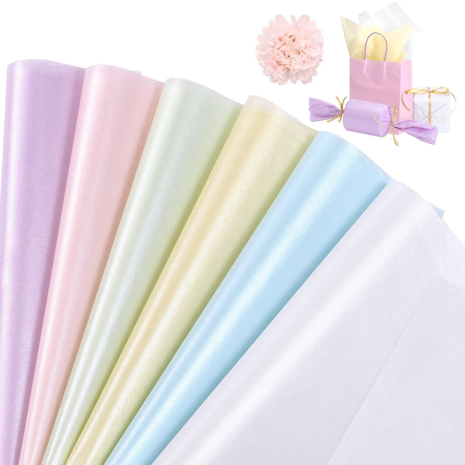 【光沢感あるパールカラー】表面にパール加工された光沢感のあるペーパー、白・黄・ピンク・紫・緑・青い合計6色!淡い色合いのパールの様な薄葉紙で、色々な用途に使えます。