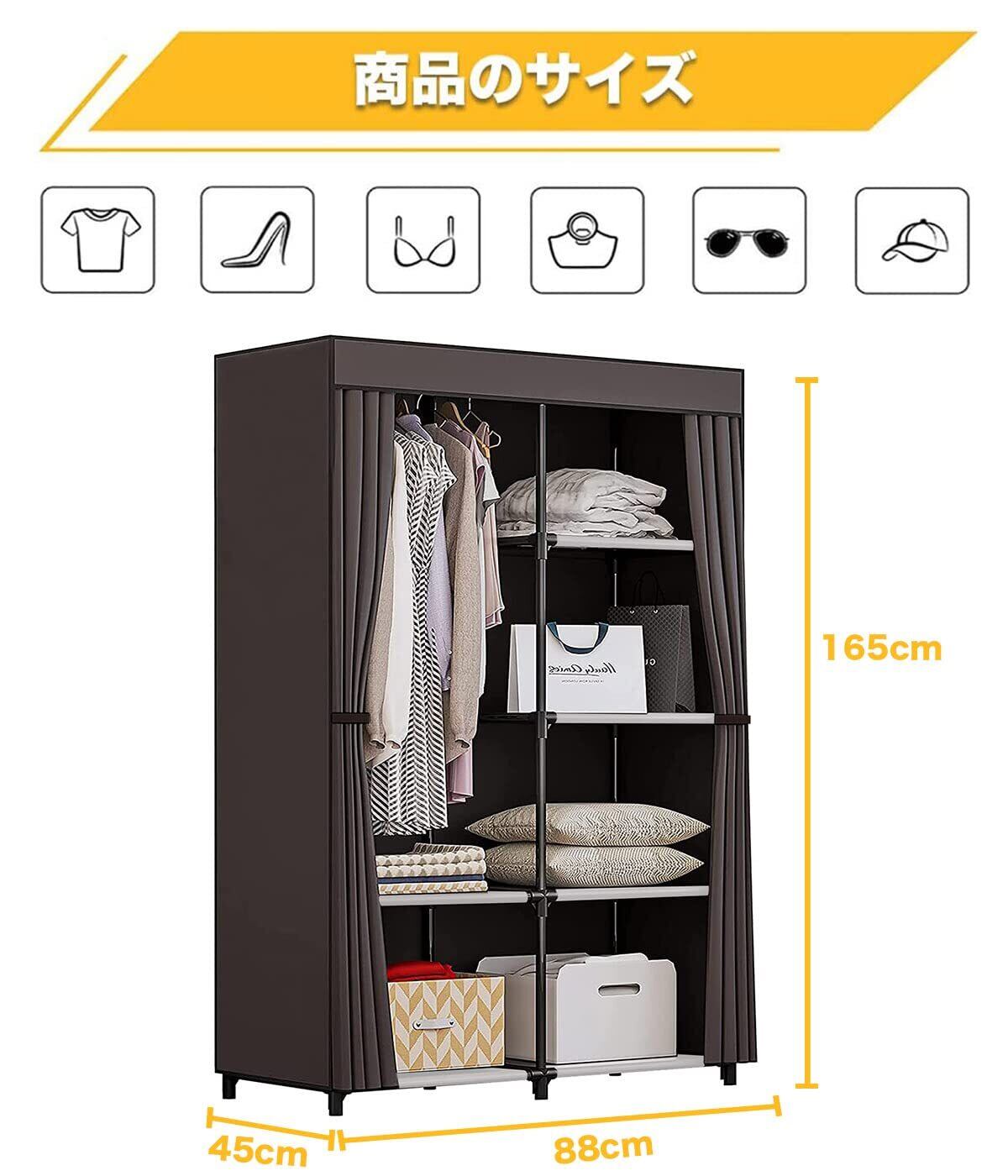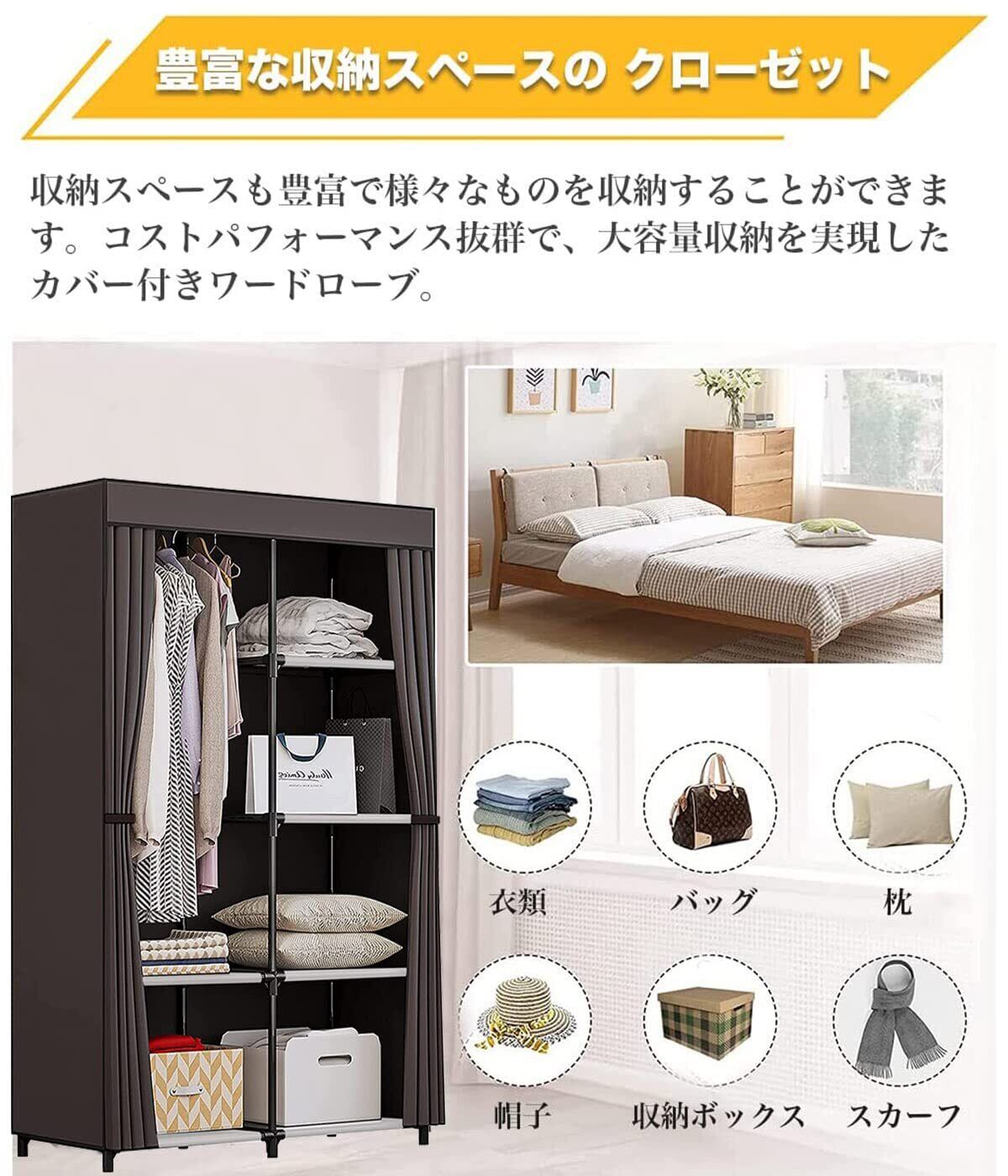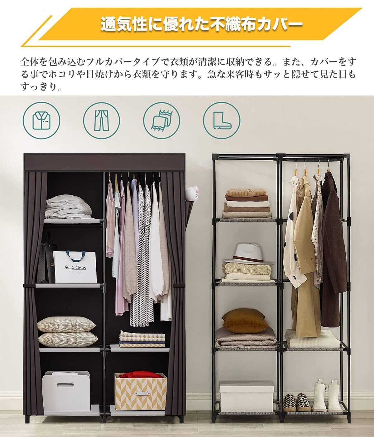 【抜群通気性があるワードローブ カバー付き】豊富な収納スペースがあり、衣類などをまるごと収納出来、カバーで隠せばお部屋がすっきりします。隠しカーテンは不織布なので通気性が良いです。また、カバーをする事でホコリや日焼けから衣類を守ります。