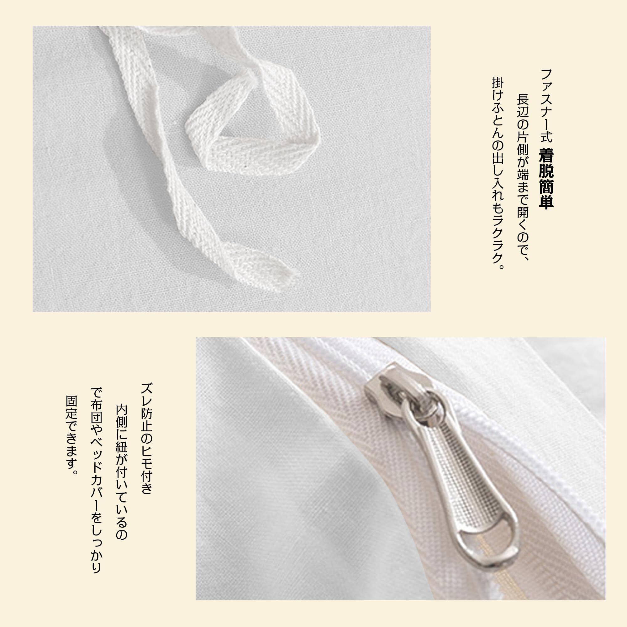 【全開ファスナー 取り付けラクラク】この布団カバーは使いやすさを追求した設計で、カバーの片側には全開ファスナーがあり、8ヶ所の紐で布団を固定できます。ぐーんと大きく開くので大変なふとんの出し入れがスムーズにできます。お手入れも簡単なので、忙しい主婦の強い味方です。一人暮らしの方や衣類のお手入れが難しい方におすすめです。