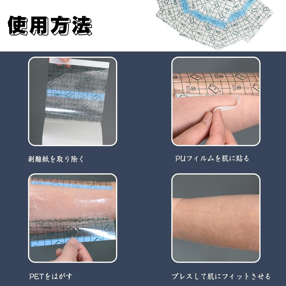 [素材]:ポリウレタン(PU)素材を使用しており、非常に柔らかく、粘着性のある裏地(PET)素材を使用しており、粘着性と通気性があります、肌に貼るとくっつく貼り付け、水が滲み込まなく、キズ口に完全的に防水され