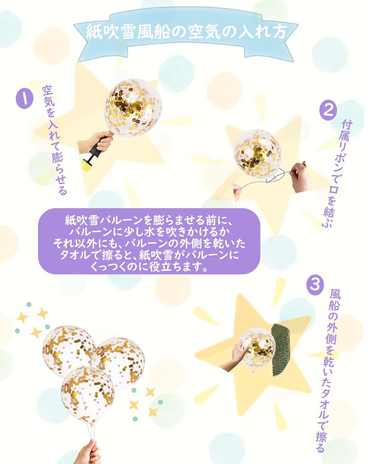 ご注意事項:本製品は装飾品となっております. 6歳未満のお子様が口にしないよう細心の注意をお願い致します. 風船に空気を入れる際は、破れないように少しずつ空気を入れてください. 特に、アルミ風船は空気を入れすぎると破裂してしまうこともあります. 指で押して、少し凹むくらいがベストです. 入荷時期により多少形や色合いが異なる場合がございますのでご了承ください. 結びリボンと壁貼り両面シールは混じて使ってください. 部屋にバルーンを貼る場所がない場合はリボンで室内の壁や窓、または庭に掛けることができます. とても便利です. 誕生日の後、 壁にダメージを与えますので、できる限りリボンを使用することをお勧め致します. リボンは長くて操作も簡単です