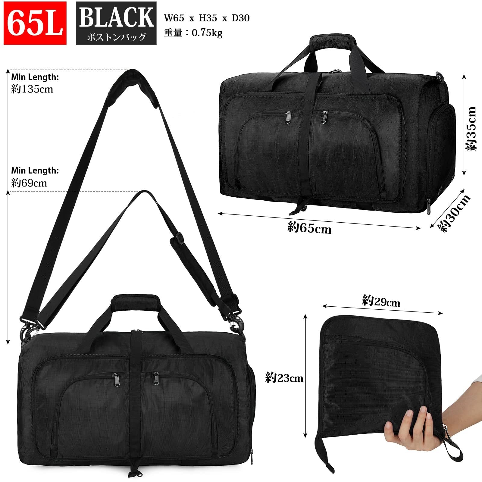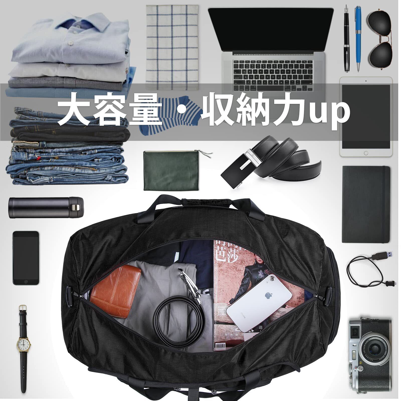 【新春セール】折りたたみ ボストンバッグ メンズ 大容量 YKKファスナー 修学旅行 トラベル スポーツバッグ 5色 40L 65L 80L 斜め掛け スーツケース固定 靴収納ポケット 撥水加工 軽量 ジム 出張 black-65L