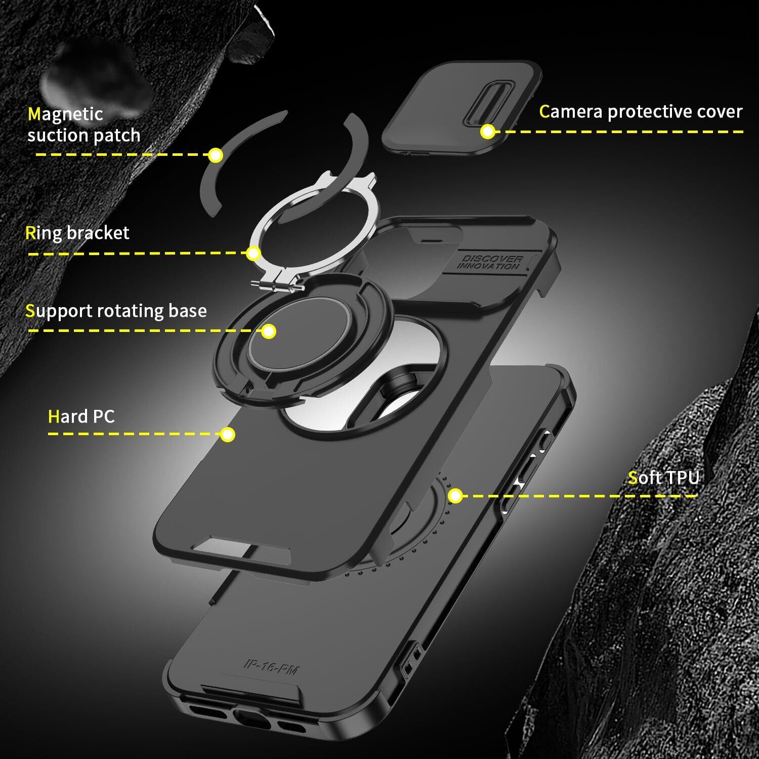 Cakublse iPhone16promax / iPhone16プロマックス 用 ケース Magsafe対応 PC + TPU 二重保護 カメラの保護 落下防止 米軍MIL規格 耐衝撃 アイホン16pro Max対応 カバー リング付き スタンド付き ブラック 黑