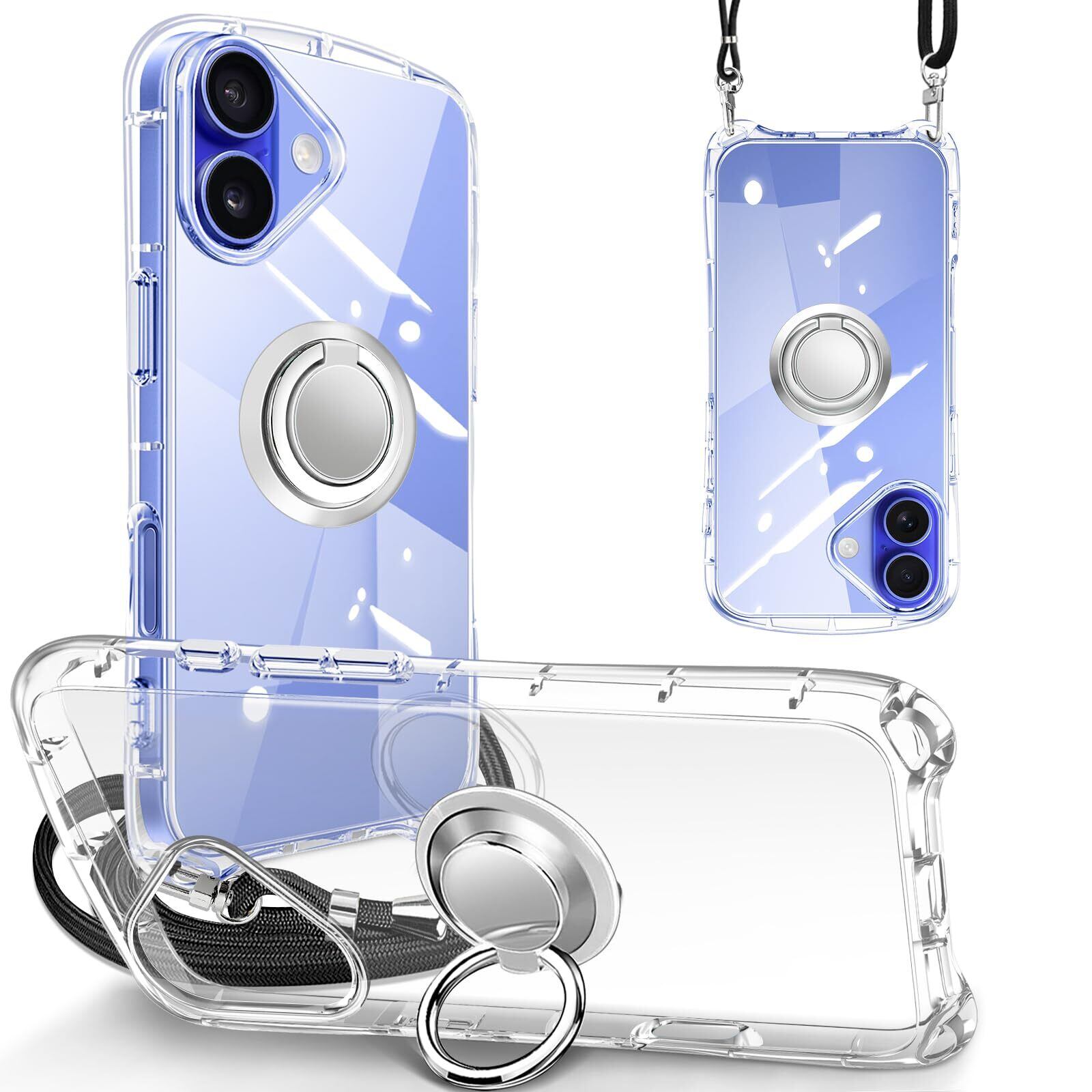 【2022最新】iPhone 16 用 ケース ショルダー ストラップ付 リング クリア iPhone16 用 カバー 透明 肩掛け 縄掛け 斜めかけ TPU 耐衝撃 スタンド機能 横置き 車載ホルダー 韓国 可愛い アイフォン16 用 スマホケース