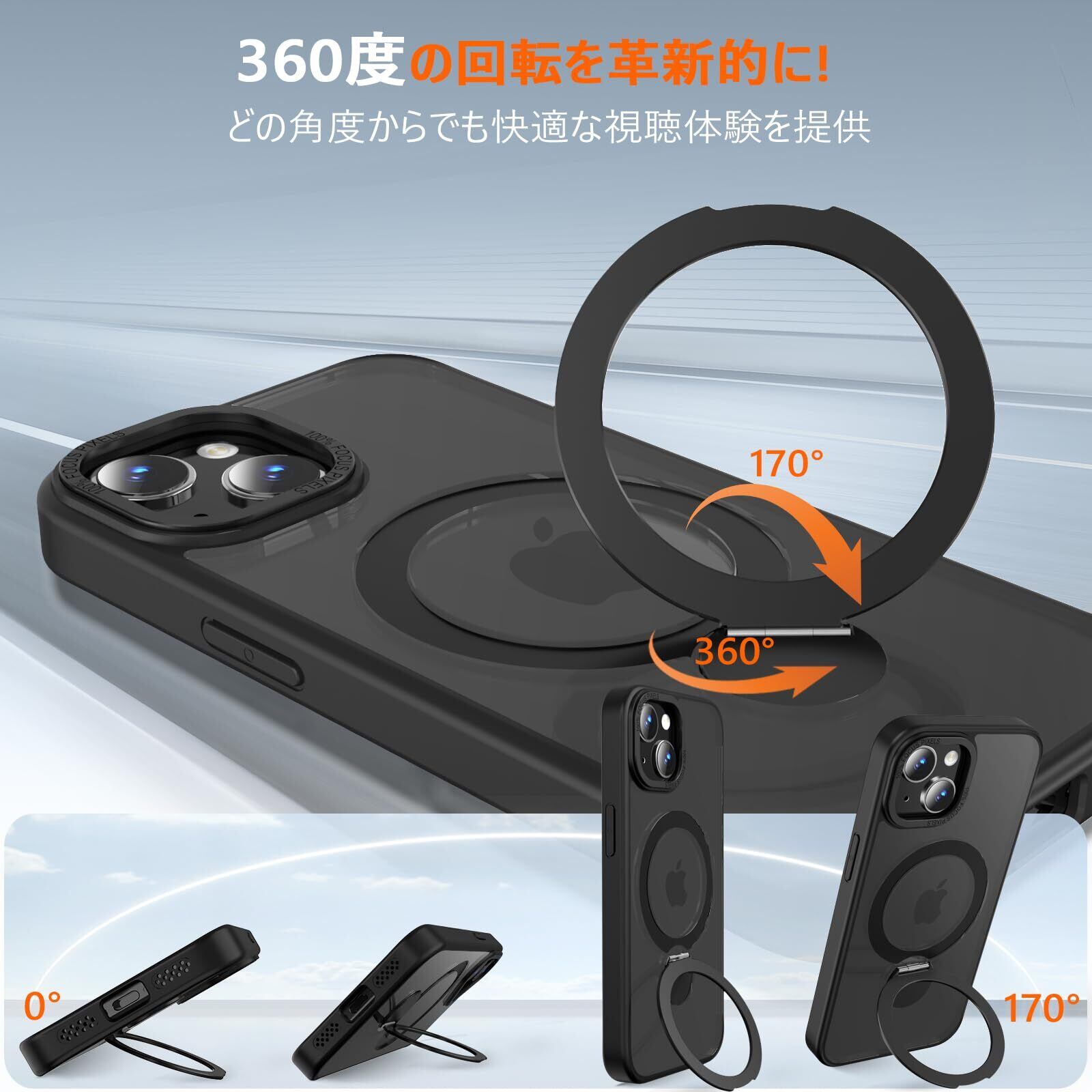 "【最新の定点360°回転技術搭載】市販の固定式スタンドケースとは異なり、 iphone15プラス用 ケースは360度定点回転に対応。縦の角度を0°~170°に無階段調節になり、スタンド機能をお好みの角度に調整できます。安定性を高めるフィックスド・ポイント・テクノロジーの磁気リング、不意に倒れる心配もありません。 指にかければリングも便利に使用でき!ケースを閉じれば背面はスマートに平坦に。円形の回転スタンドを回転させると「カチカチ」と快い音が鳴り、ストレス解消グッズに早変わり。 "