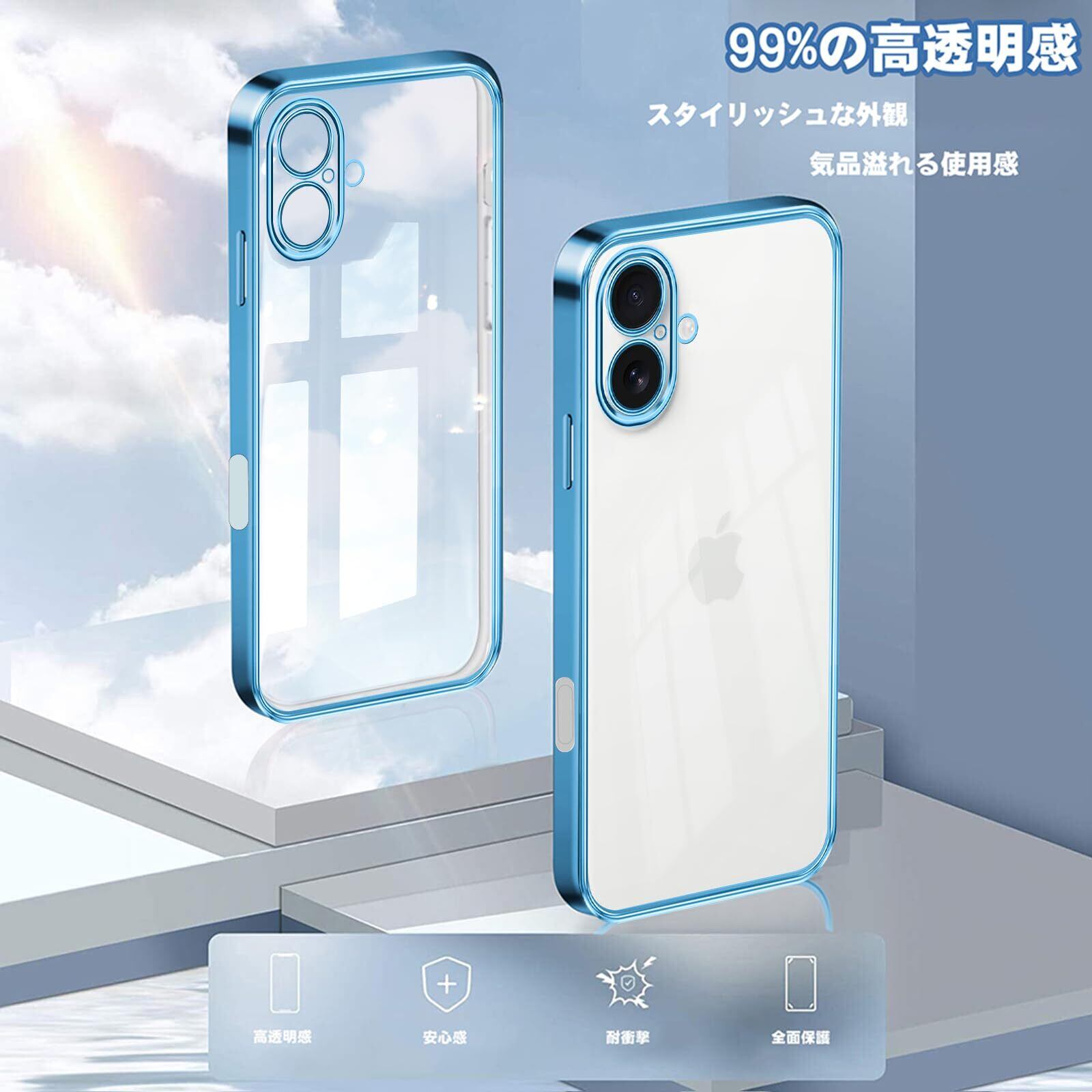 iPhone 16 用 ケース クリア レンズ保護 TPU 透明 耐衝撃 軽量「改良モデル」 ストラップホール付き ワイヤレス充電 アイフォン16 カバー 6.1インチ スマホケース ブルー