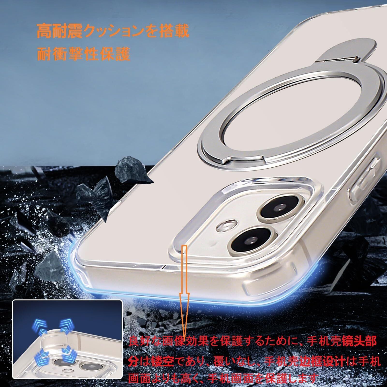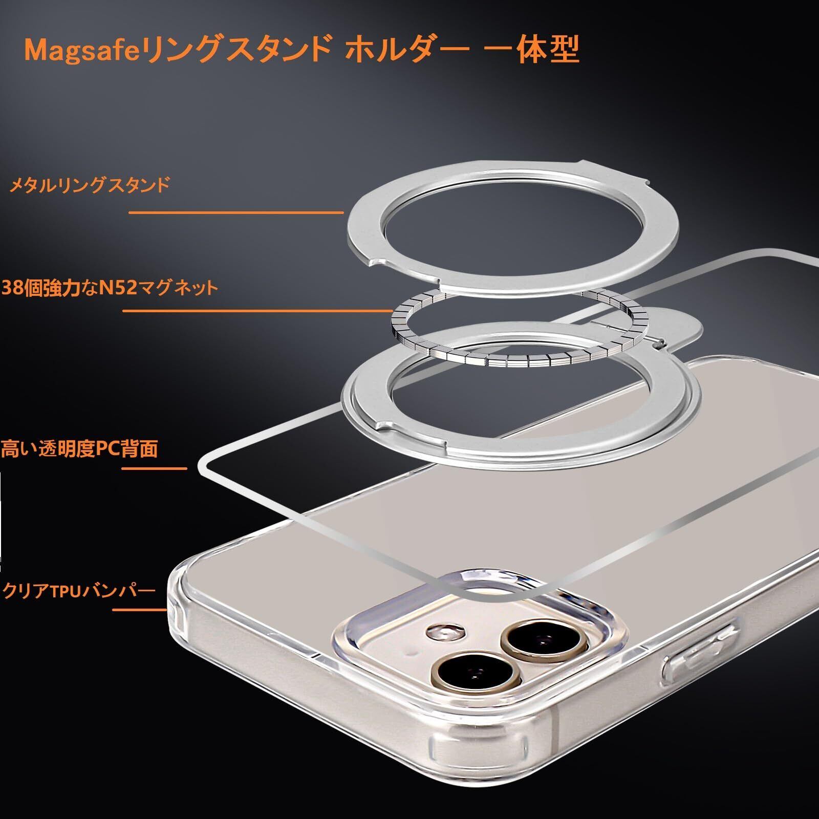 特徴 Magsafeリングスタンド ホルダー 一体型, Magsafe対応, 隠しスタンド機能 縦横両対応