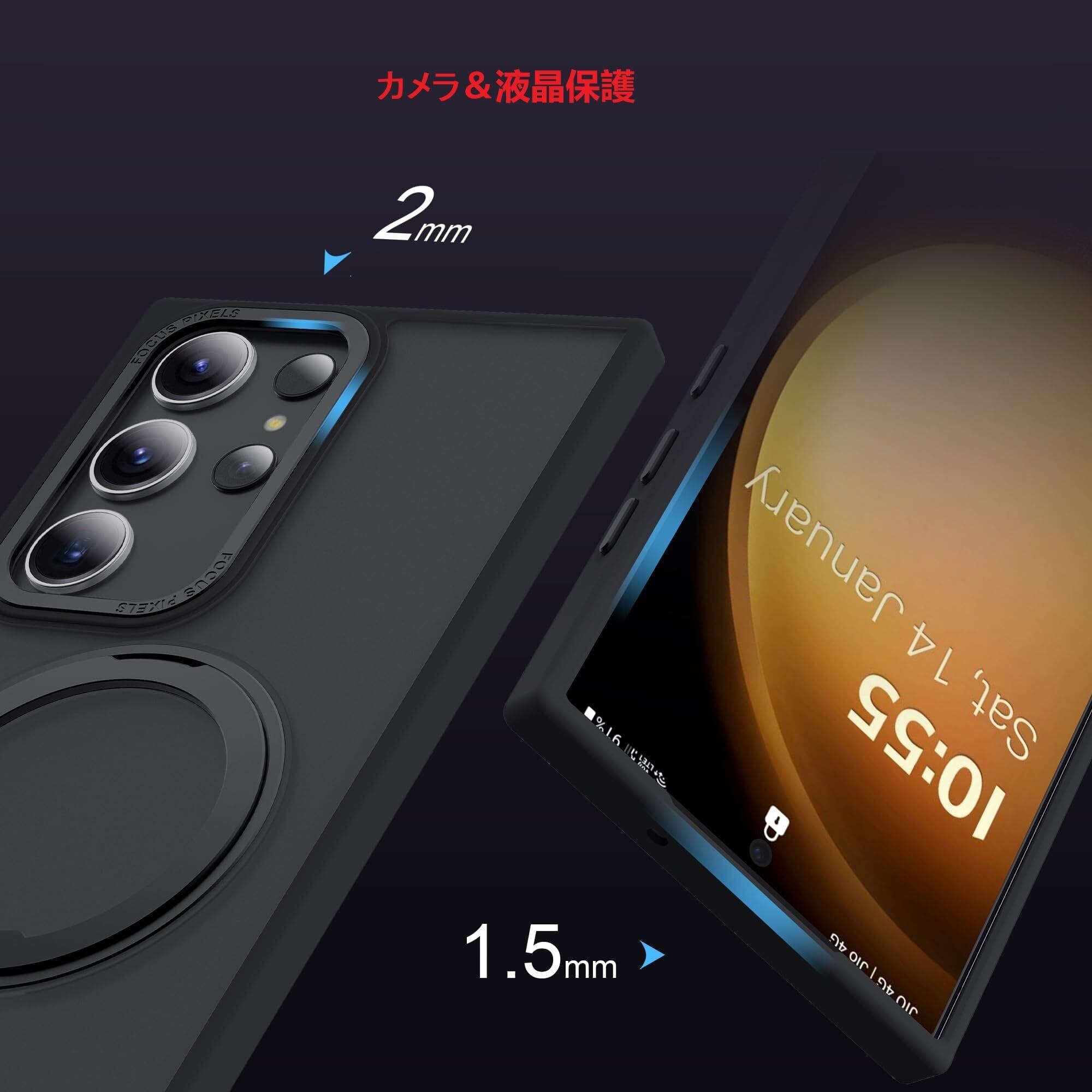 【在庫セール】Galaxy S25 Ultra 用 ケース Magsafe対応【360°回転可能な Magsafeリングス・ストラップ1種付き】ギャラクシーS25ウルトラ SC-52E SCG26 5G カバー スタンド機能 縦横両対応 HILEGENER スマホケース 耐衝撃 カメラレンズ保護 半透明 マット感 隠しスタンドケース ストラップホール付き S25 Ultra-ブラック