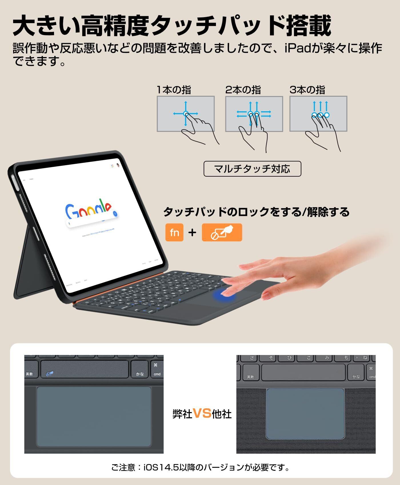 【大きい高精度タッチパッド搭載】 ipad air キーボードの大型トラックパッドは誤作動や反応悪いなどの問題を改善しましたので、高精度で、iPadも楽々に操作できます。タッチパッドは必要ない時、ロックされることができます。ご注意:お使いの端末はiOS14.5以降のバージョンにアップデートしていない場合はタッチパッド機能が利用できません。
