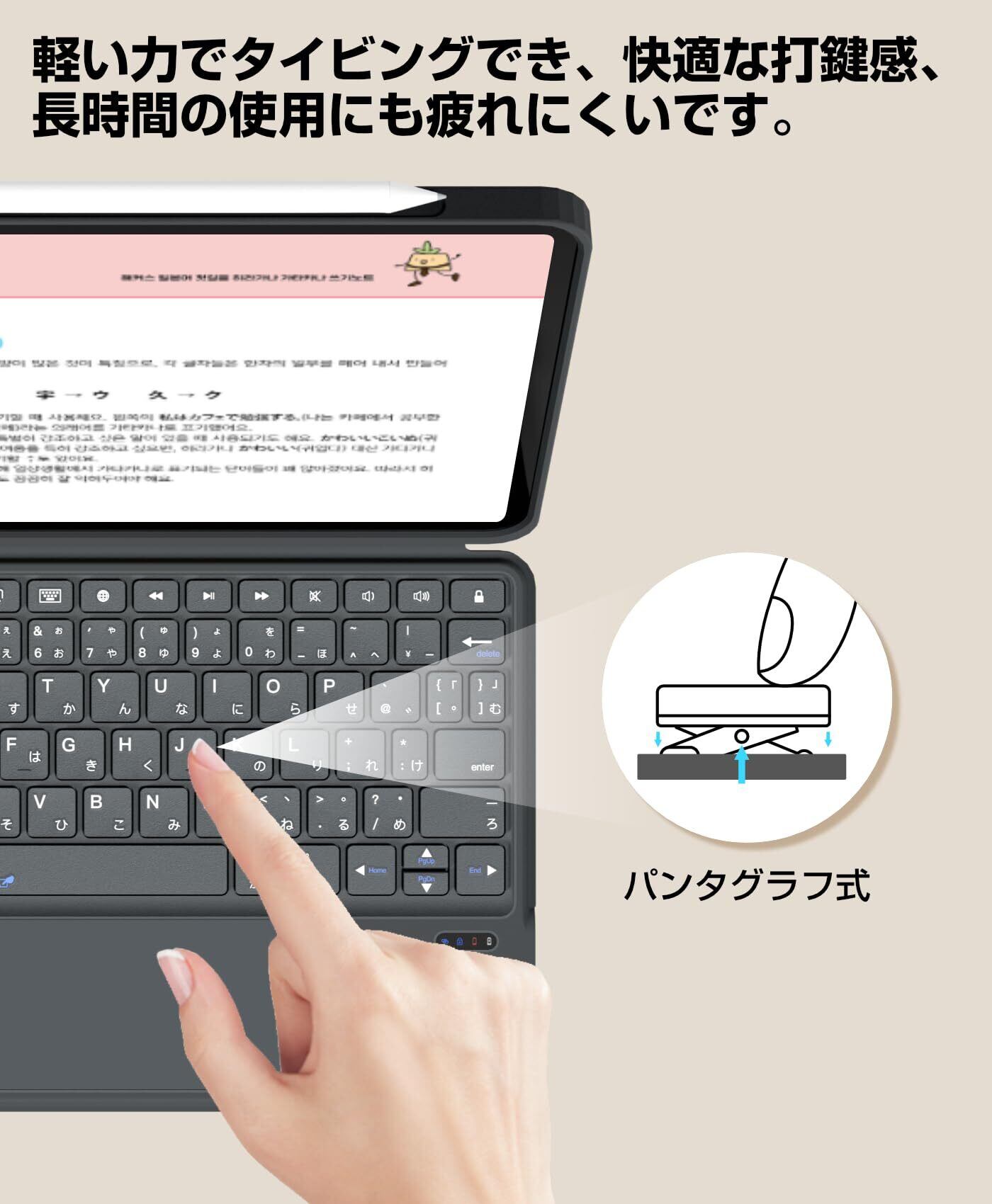 【JIS日本語配列マルチメディアキー搭載パンタグラフ式マルチペアリング機能搭載bluetooth5.3キーボード付き】 ipad 10世代 ケース キーボードはJIS日本語配列レイアウトを採用し、マルチメディアキーを搭載していて、音量調整やメディアプレーヤーの操作などがキーボードから手を離さずに簡単に操作できます。ipad keyboardは、パンタグラフキータイプで、軽い力でタイピングでき、長時間の使用にも疲れません。 ipad キーボードは2台のiOSデバイスとペアリング可能で、fn+A/Sを押すだけで自由に切替、複数台のデバイスを使いたい人におすすめ。