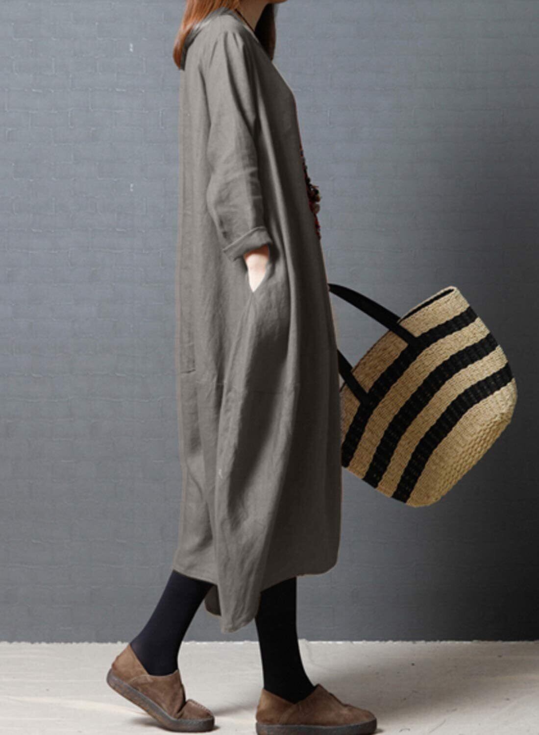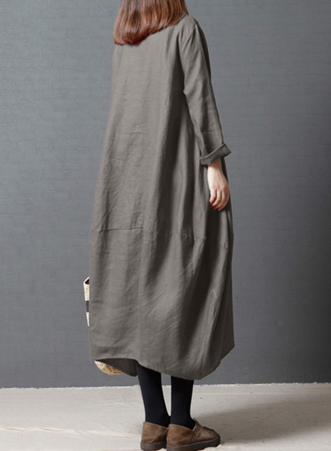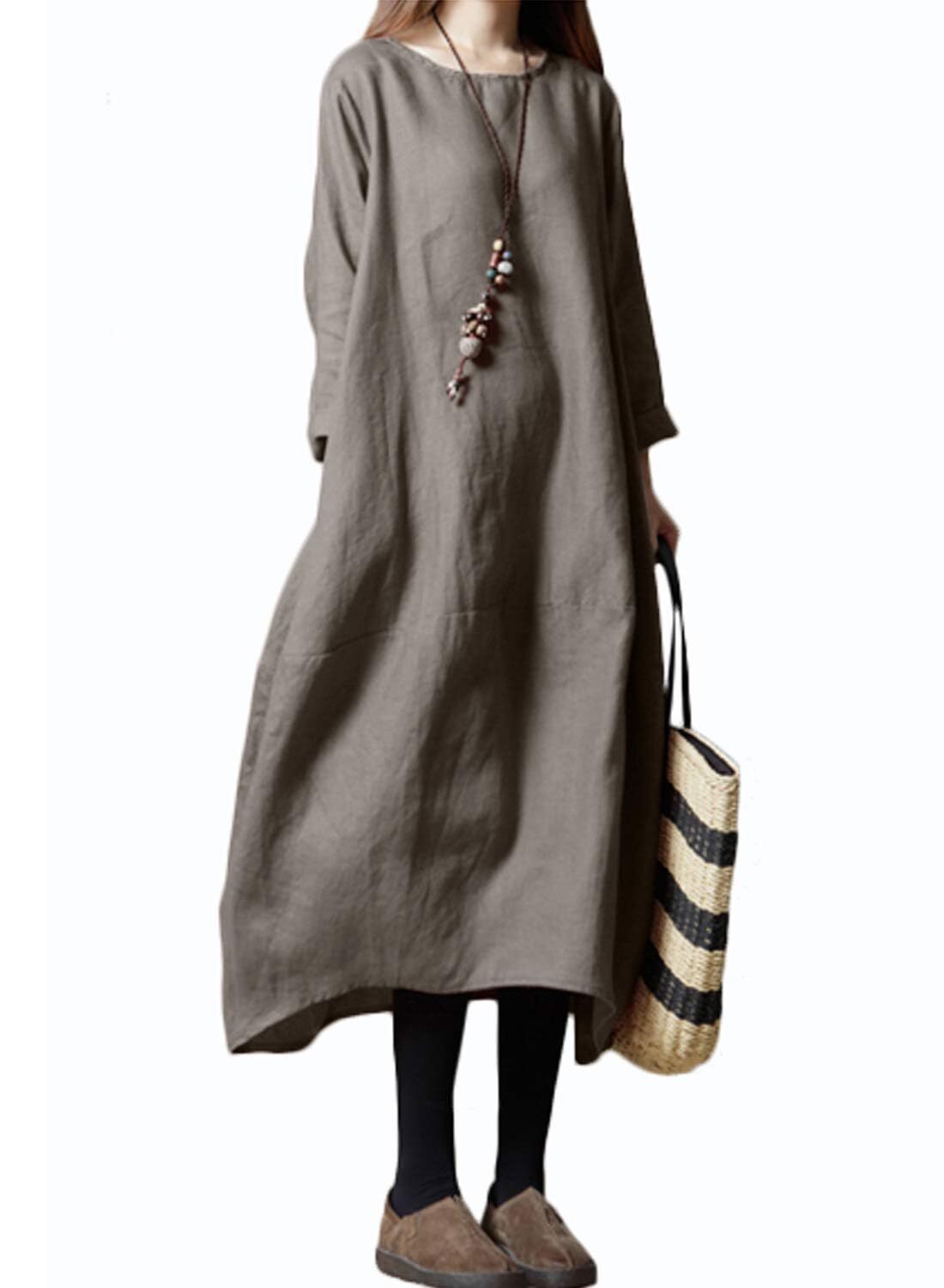 [JINJUDUO] ワンピース レディース ロングワンピース 夏 長袖 薄い コットンリネンワンピース 着痩せ チュニック マキシ丈 トップス ゆったり 無地 秋 綿 体型カバー 大きいサイズ レディース服