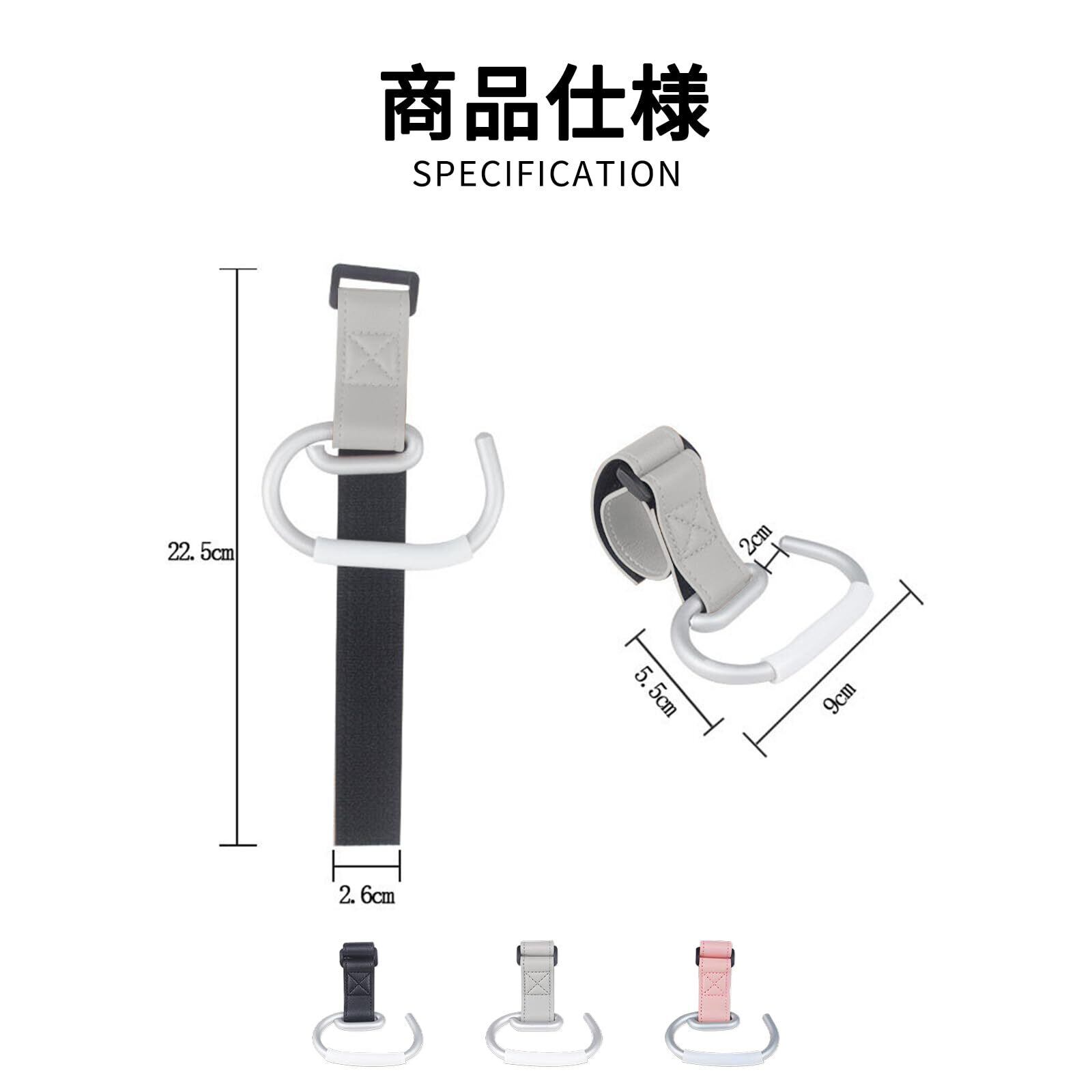 【セット内容】フック2個セットです。サイズ:ベビーカーフック、重量40g。サイズは長さ:13cm、幅:9cm。カラー:ブラック/グレー/ピンク。
