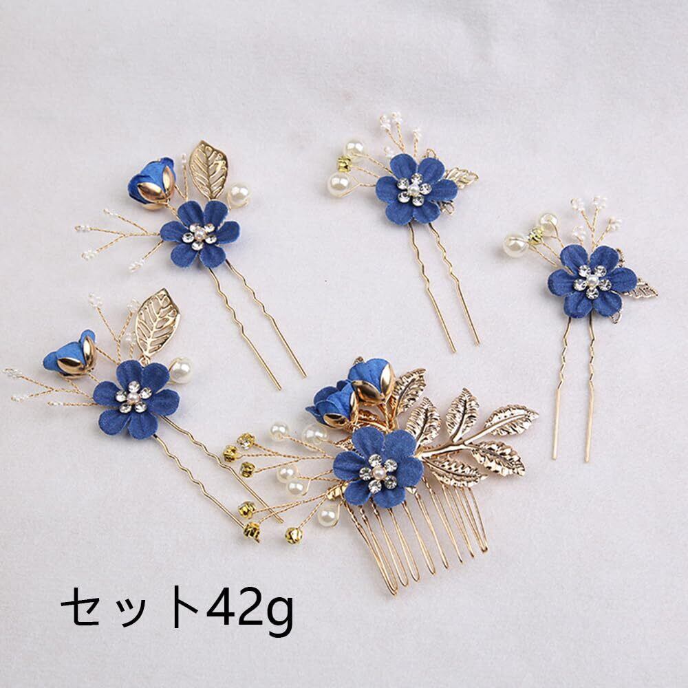 髪飾り 5点セット ヘッドドレス パール フラワー コーム Uピン ヘアピン 成人式 結婚式 発表会 卒業式 パーティー 和装用髪飾り 上品 華やか ギフト対応(青)