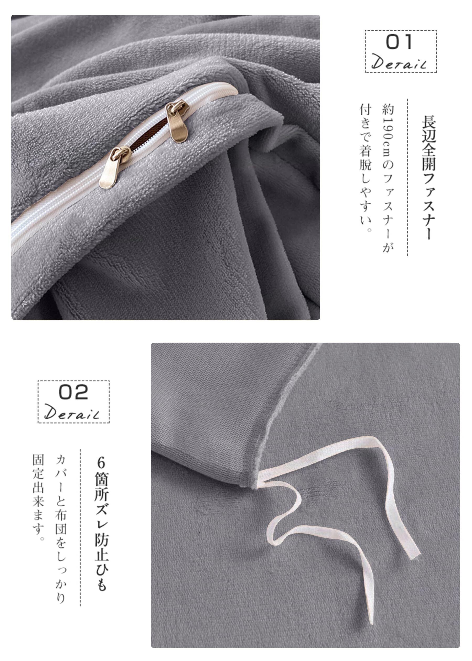 【お手入れ簡単】❶【ご自宅で丸洗い可能】:おうちで洗濯機で丸洗いでき、汚れてもご自宅で簡単に洗えます。面倒家事も短縮できます。 お気に入りの香りで仕上げると、より幸せな気分になります。 絞って干すだけで数時間で乾きます。 毛足が短いので、掃除や長期間使用しても、ゴワゴワの束感になりません。❷片側に210cm全開ファスナーを開閉出来る仕様を採用しますから着脱しやすいです。