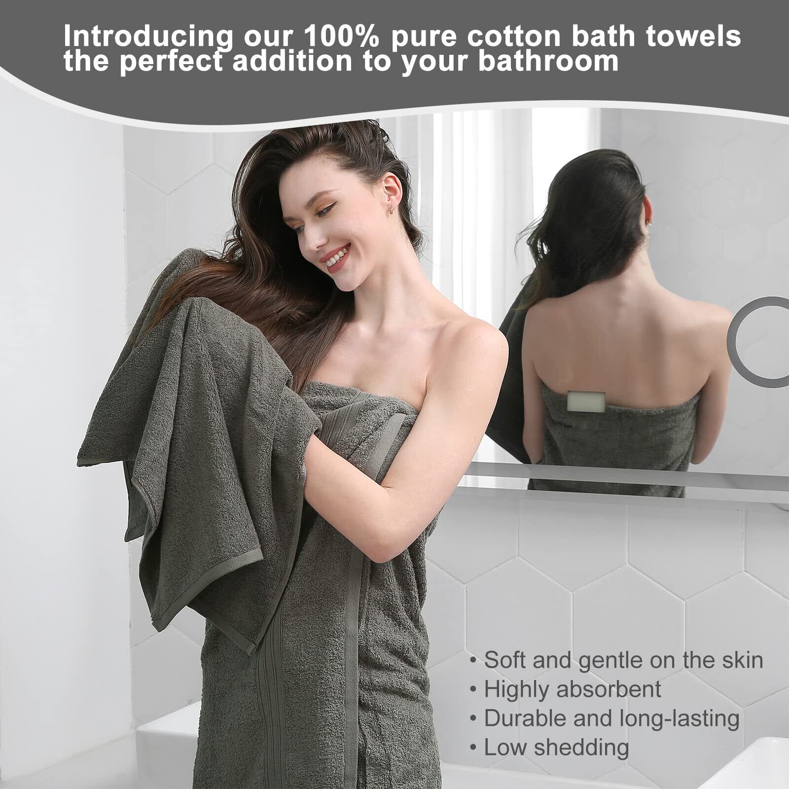 【高品質の綿バスタオル 4枚セット】サイズ:約60×120cm、重量:約290g ,このバスタオルは、綿糸の中でも最高級の「コーマ綿」繊維を使用しており、長繊維を丁寧に加工することで、柔らかくしっとりとした肌触りを実現しました。掉毛が少なく、長期的な使用にも耐えられます。洗濯しても毛羽立ちが少なく、清潔感を保ちやすく、長くお使いいただけます。