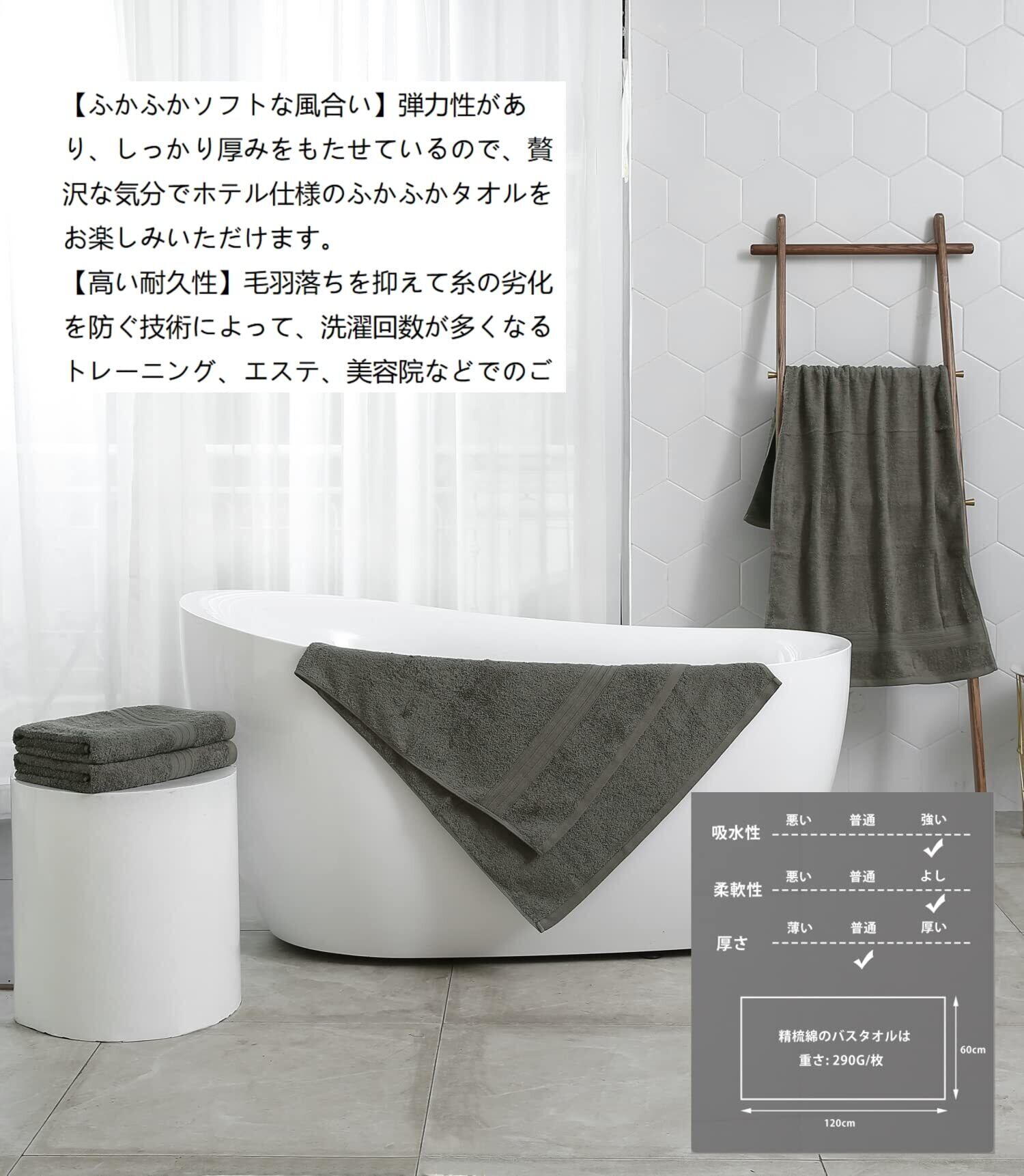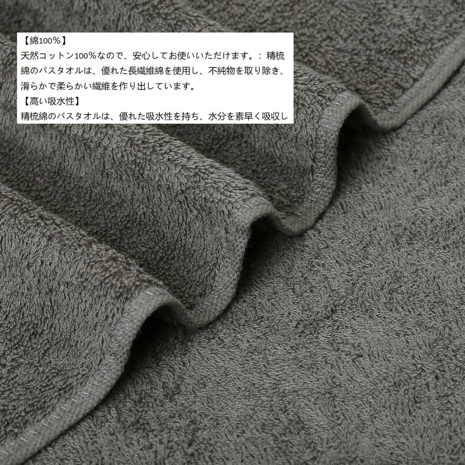 【高い吸水性】:精梳綿のバスタオルは、優れた吸水性を持ち、水分を素早く吸収し、お風呂やシャワー後に快適なドライな肌触りを実現します。お風呂から上がったときに、しっかりと水分を吸収してくれます。また、水泳後や運動後など、汗をかいたときにも、速乾性が高いため、すぐに乾かすことができます。