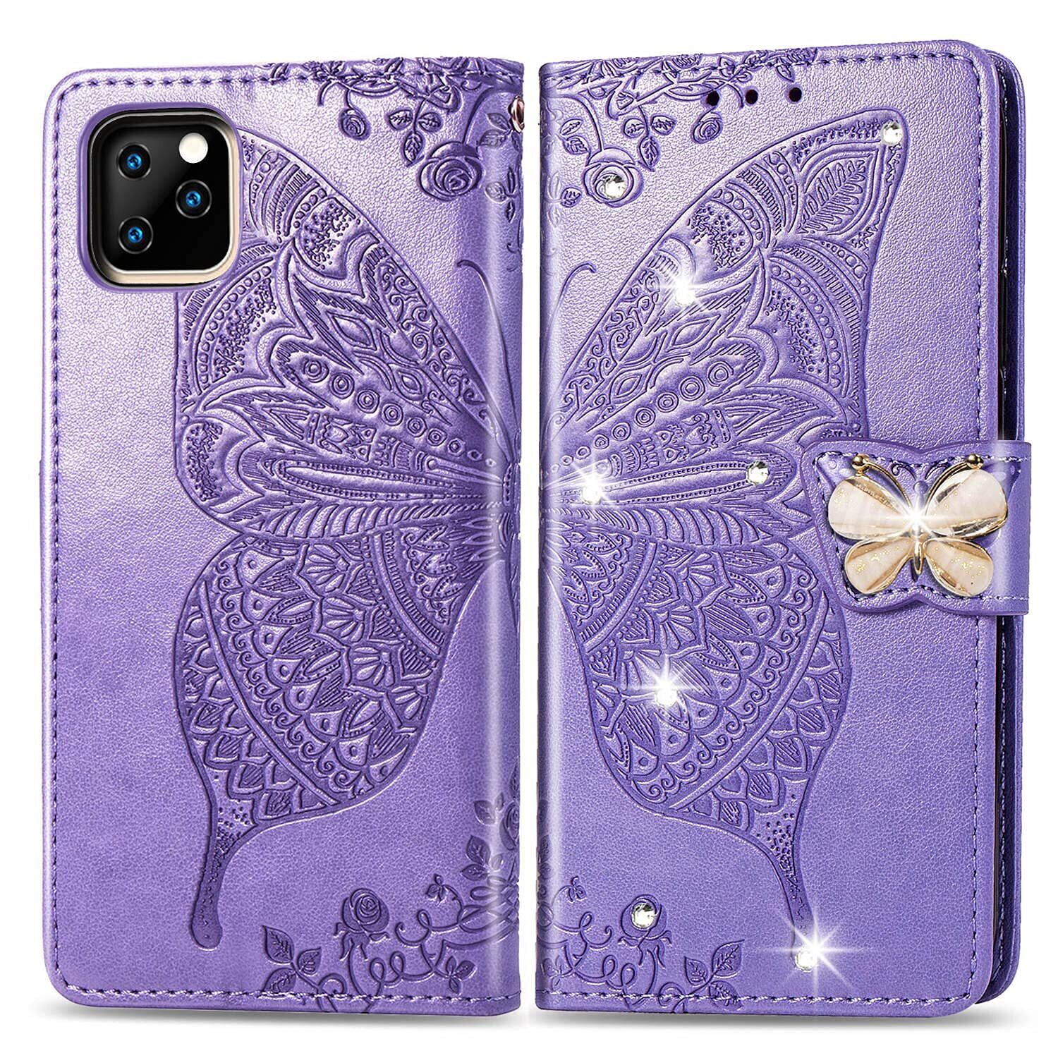 iphone 13 / iphone 14 用 ケース 手帳型 かわいい おしゃれ 蝶 蝶柄 きらきら ラインストーン 蝶々 デザイン カード 収納 ストラップ 付き 耐衝撃 アィフォン 13/14 スマホケース ハンドメイド 女性 優雅 純色 手帳ケース PUレザー 携帯カバー パープル