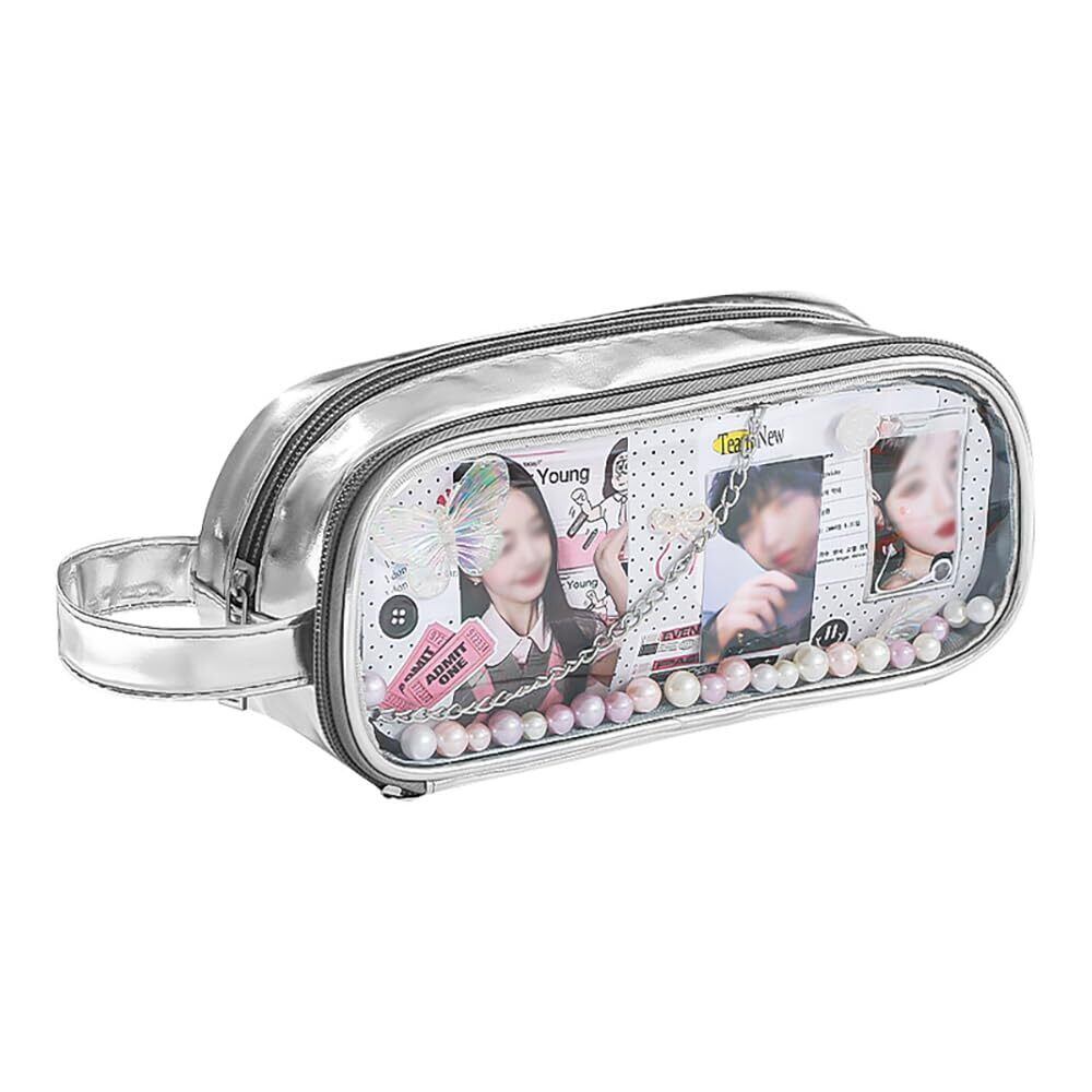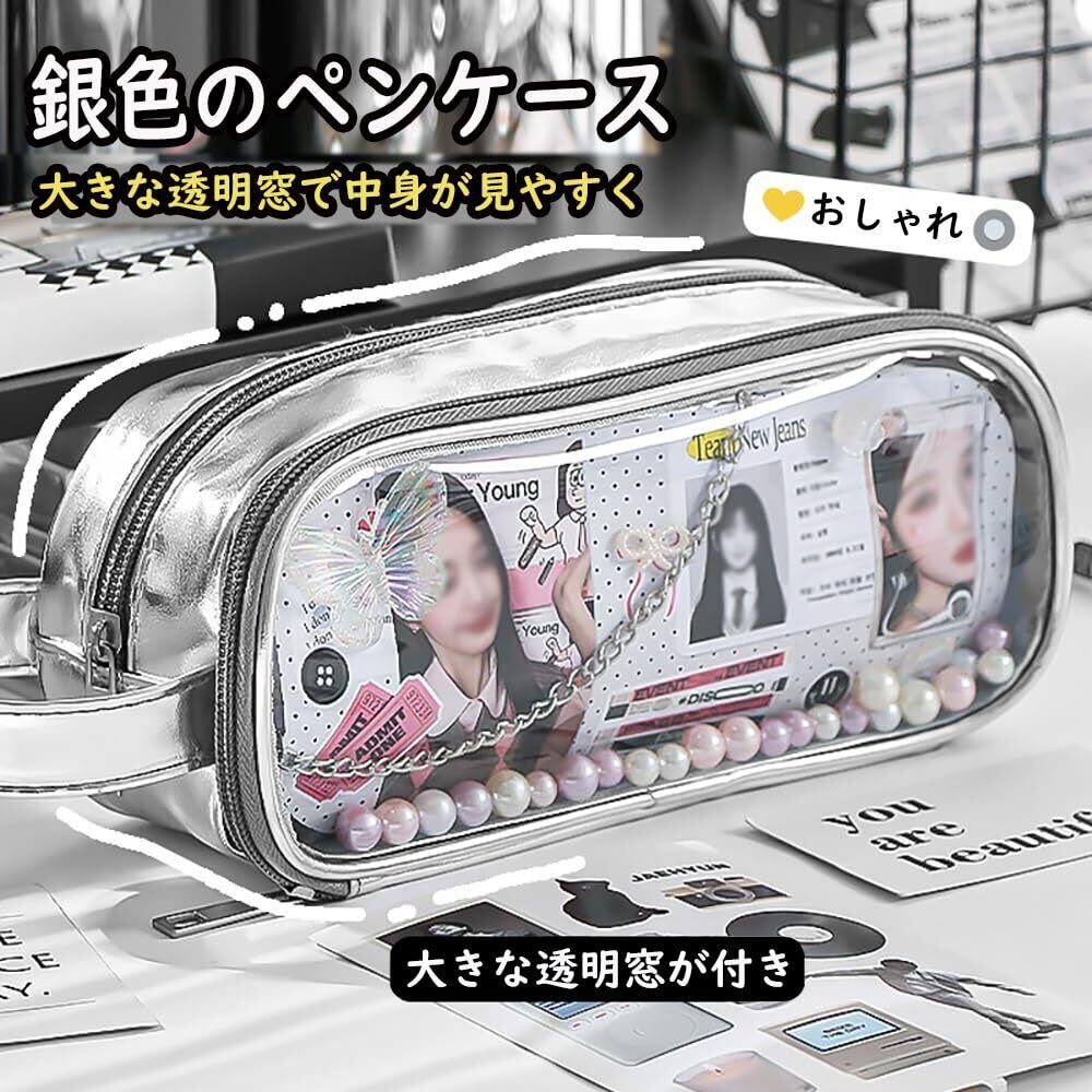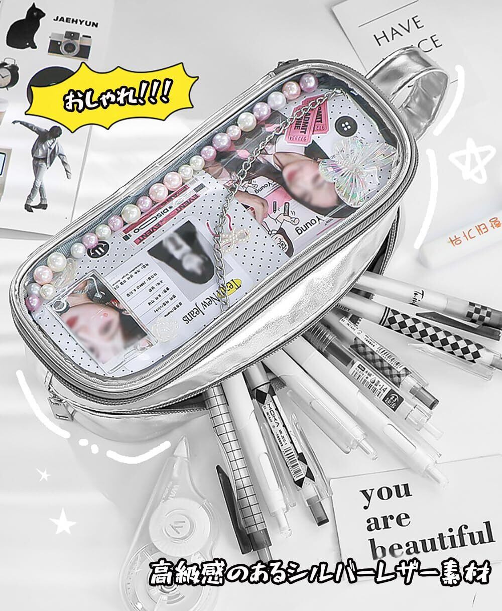 【銀色の痛バッグ風ペンケース】 ペンケースの前面には防水性のあるPVC透明窓が付いており、好きなグッズを入れて痛バッグ風にアレンジできます。