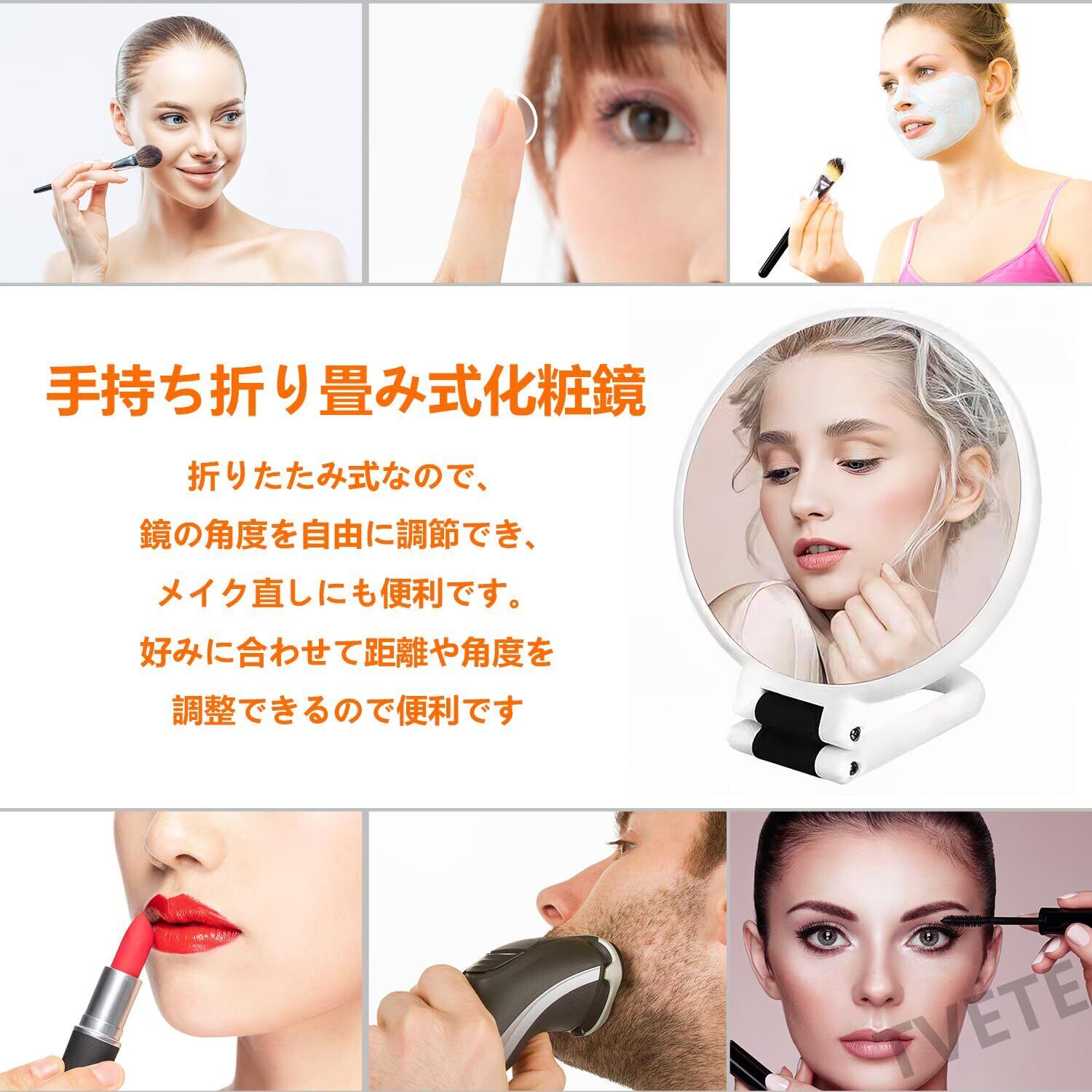 折りたたみ式ハンドル: 手持ち拡大鏡は、手持ち、卓上、吊り下げミラーとして使用でき、フレキシブルなハンドルで、日常使いや旅行に最適です。また、持ち手部分を折りたたむことで、ミラーを垂直に立て、卓上ミラーとして使用することもできる。