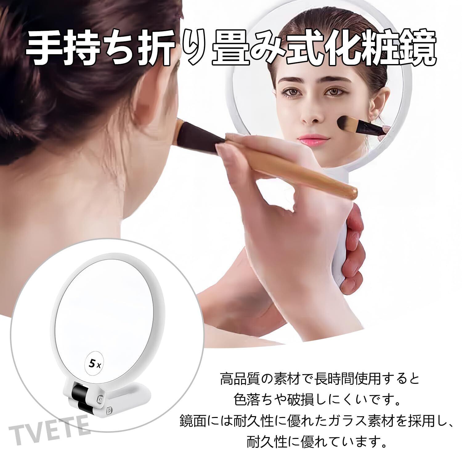 ・内容:5倍拡大鏡と通常鏡の両面仕様、折り畳み式の卓上鏡