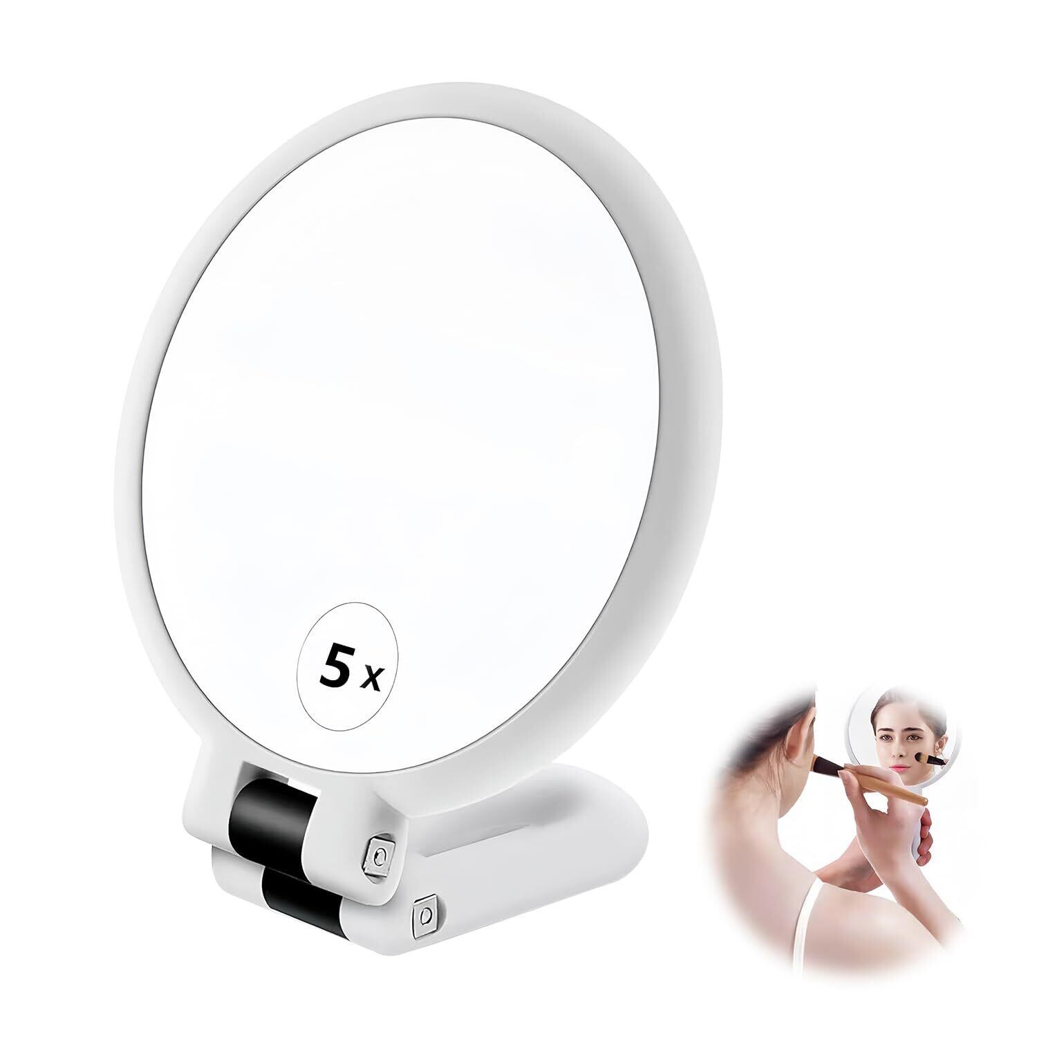 手鏡 5倍拡大鏡 卓上鏡 ハンドル付き両面鏡 スタンドハンドミラー 折り畳み式化粧鏡 円形 ホワイト
