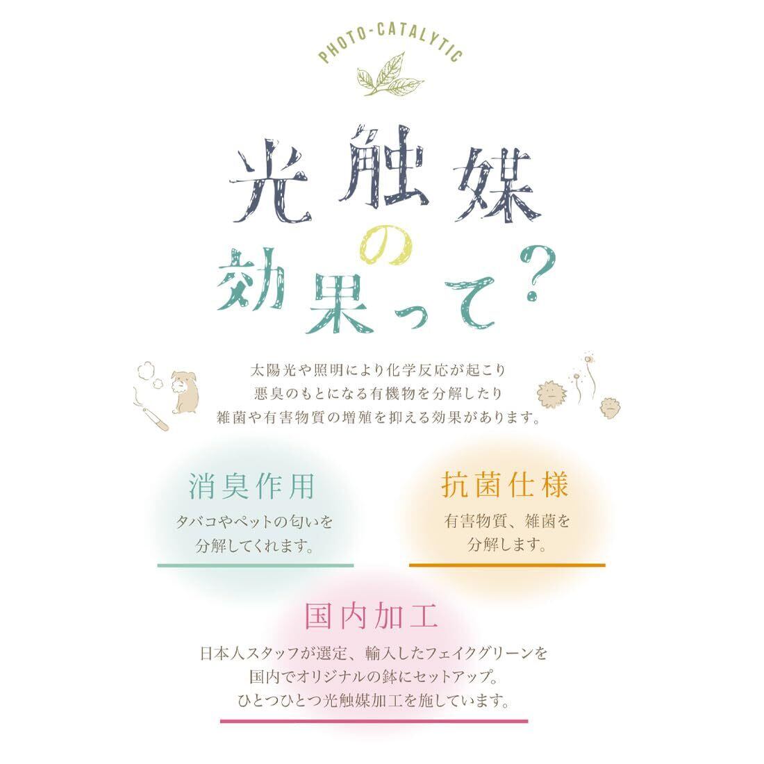 このフェイクグリーンは光触媒技術を使用しており、空気中の有害物質を分解し、クリーンな空間を保ちます。見た目だけでなく、機能性にも優れています。