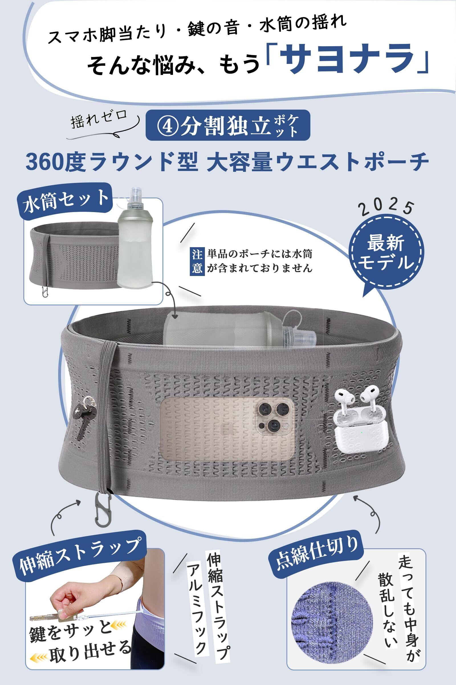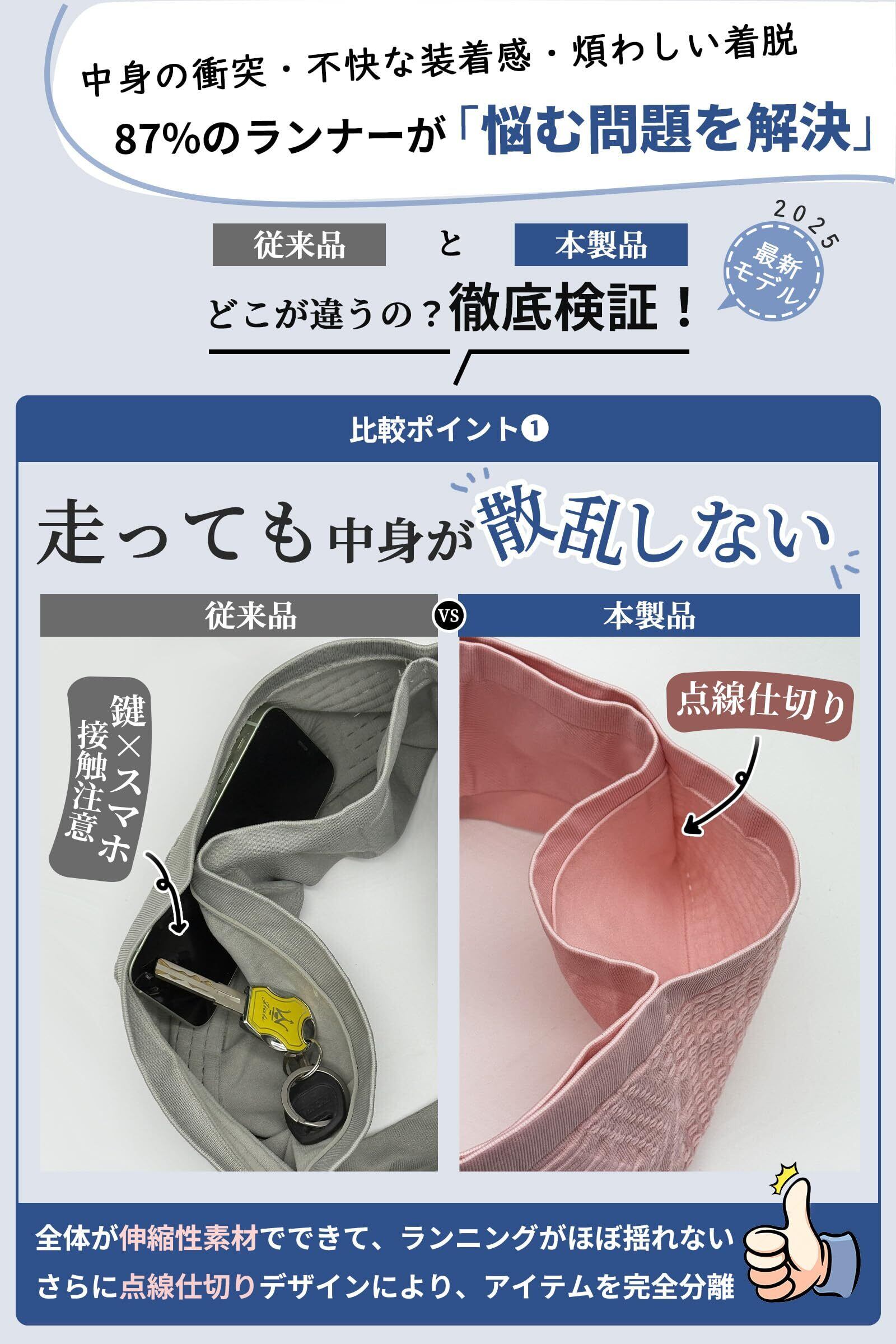 【他と違う!360度フィット】従来のウエストポーチと異なり、全体が伸縮性素材でできて、ランニングがほぼ揺れない!さらに新設計の「点線仕切り」を内側に採用し、スマホ・鍵・水筒などがポーチに動き回るのを防止