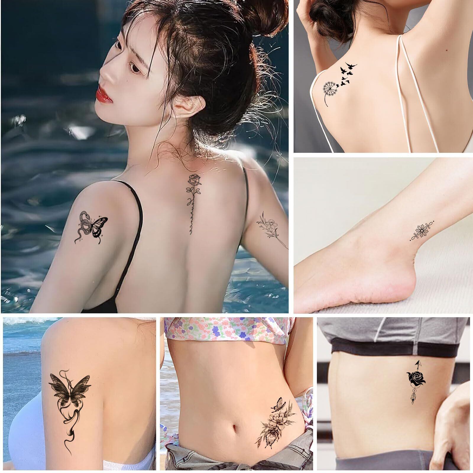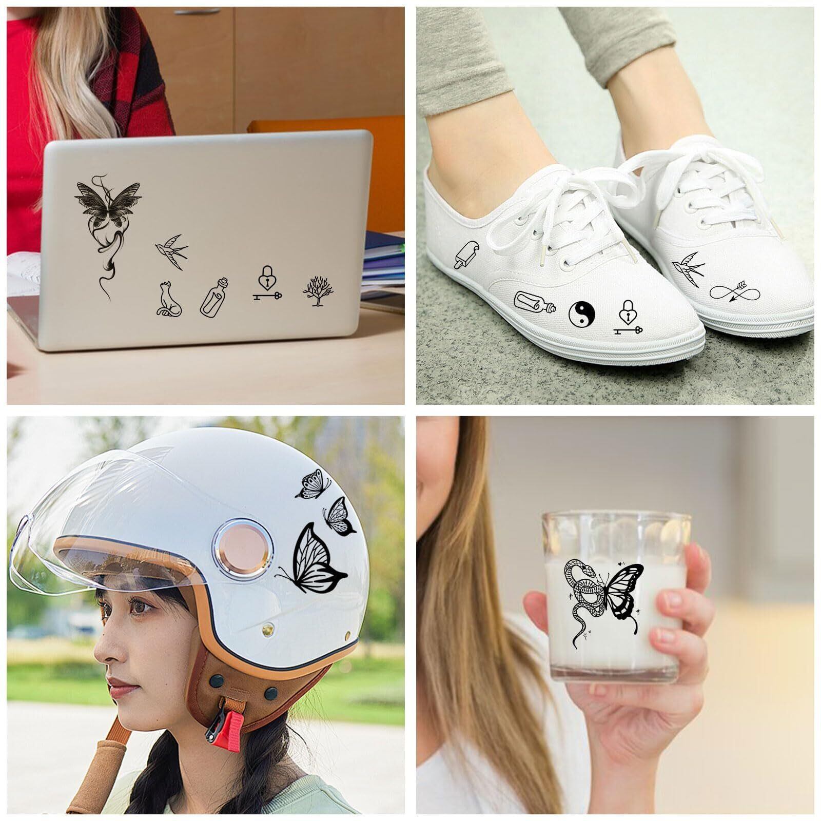 様々なデザイン:蝶々、花、笑顔、文字、猫、笑顔、星、ハート、オーナメント、音符、サソリなど、このタトゥーシールには数十種類のデザインがあります。更に、サイズもたくさん用意しているので、指や手首、足首、胸、デコルテ、耳の後ろ、肩、背中、お腹、腰など、ほとんど部位に対応できます