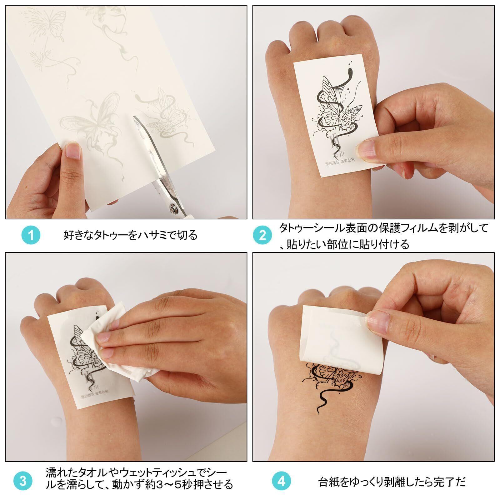 入れ墨シール 貼り方:1.好きな絵柄をハサミで切り取る。2.貼りつける箇所をキレイに拭き取る。3.タトゥーシールの表面の保護フィルムを剥がしてから、印字面を肌に貼り付ける。4.よく濡らしたティッシュを上から軽く押さえて、端までよく湿らせる(20~30秒を待つ)。5.台紙をゆっくり剥がす。6.水分を拭き取り、乾燥させたら完成。*貼り付けたら、3時間以内水を濡れないでください。塗ったばかりの時はあまり色が出ませんが、12~24時間経ったら色がどんどん出ます