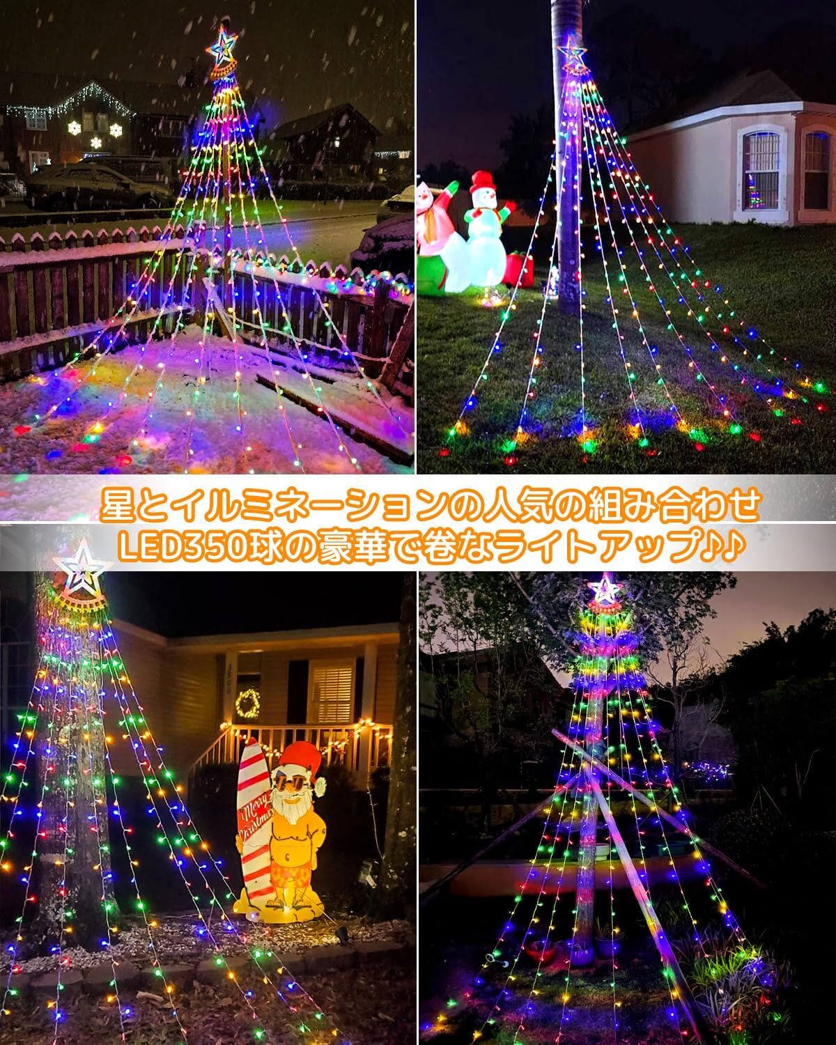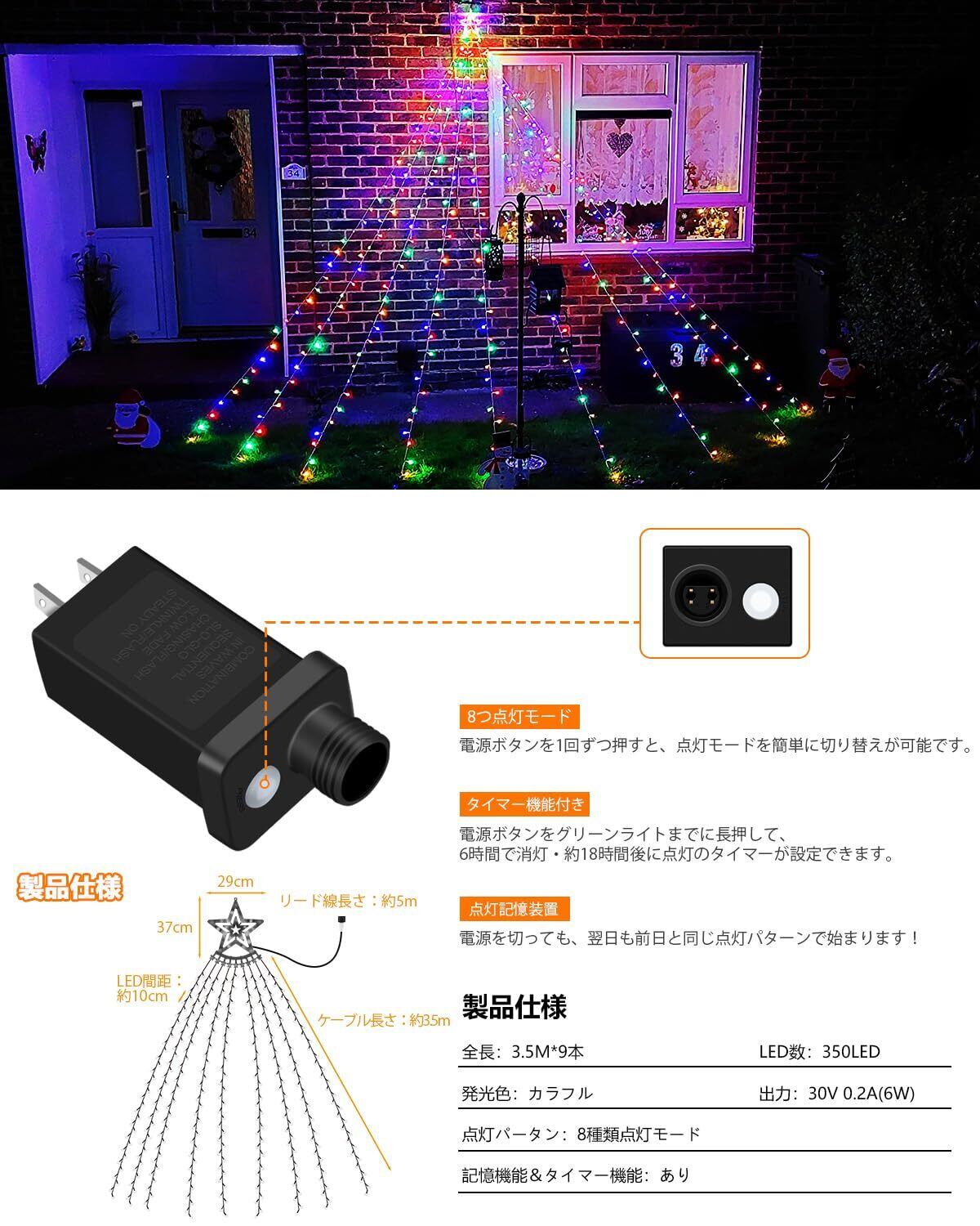・内容:「LED イルミネーションライト」は、特別な演出を必要とするクリスマスやパーティー、イベントにぴったりのアイテムです!屋外対応の防水設計で、どんな天候でも安心して使用できます。長さ3.5Mのストリングライトは、350球の美しい光を放ち、幻想的な雰囲気を演出します。