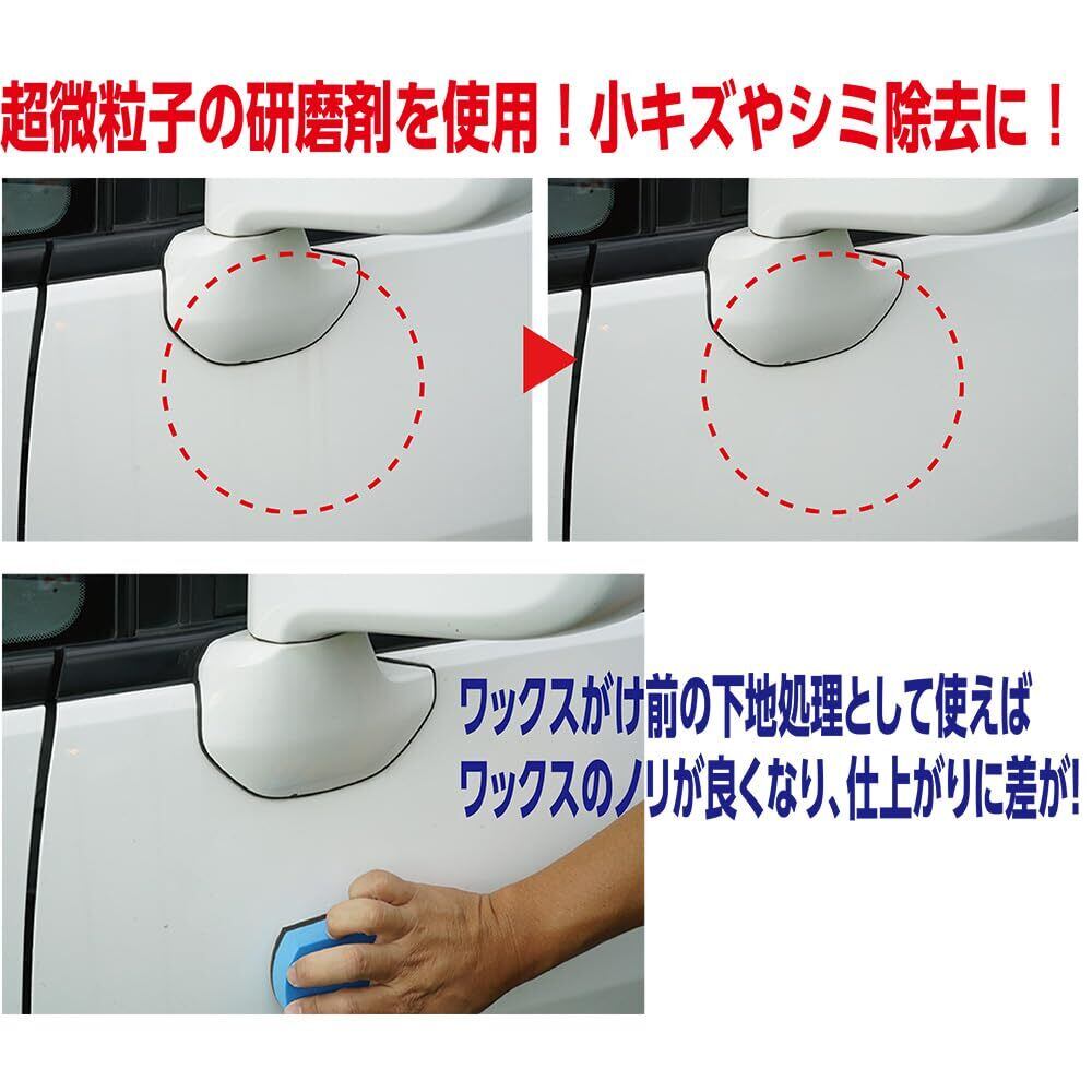 ●液体コンパウンドに匹敵する超微粒子の研磨剤を使用、塗面を削りすぎることなく劣化塗膜や細かなスリキズ、シミをキレイに消し去り、光沢感のある塗面を復活させます。