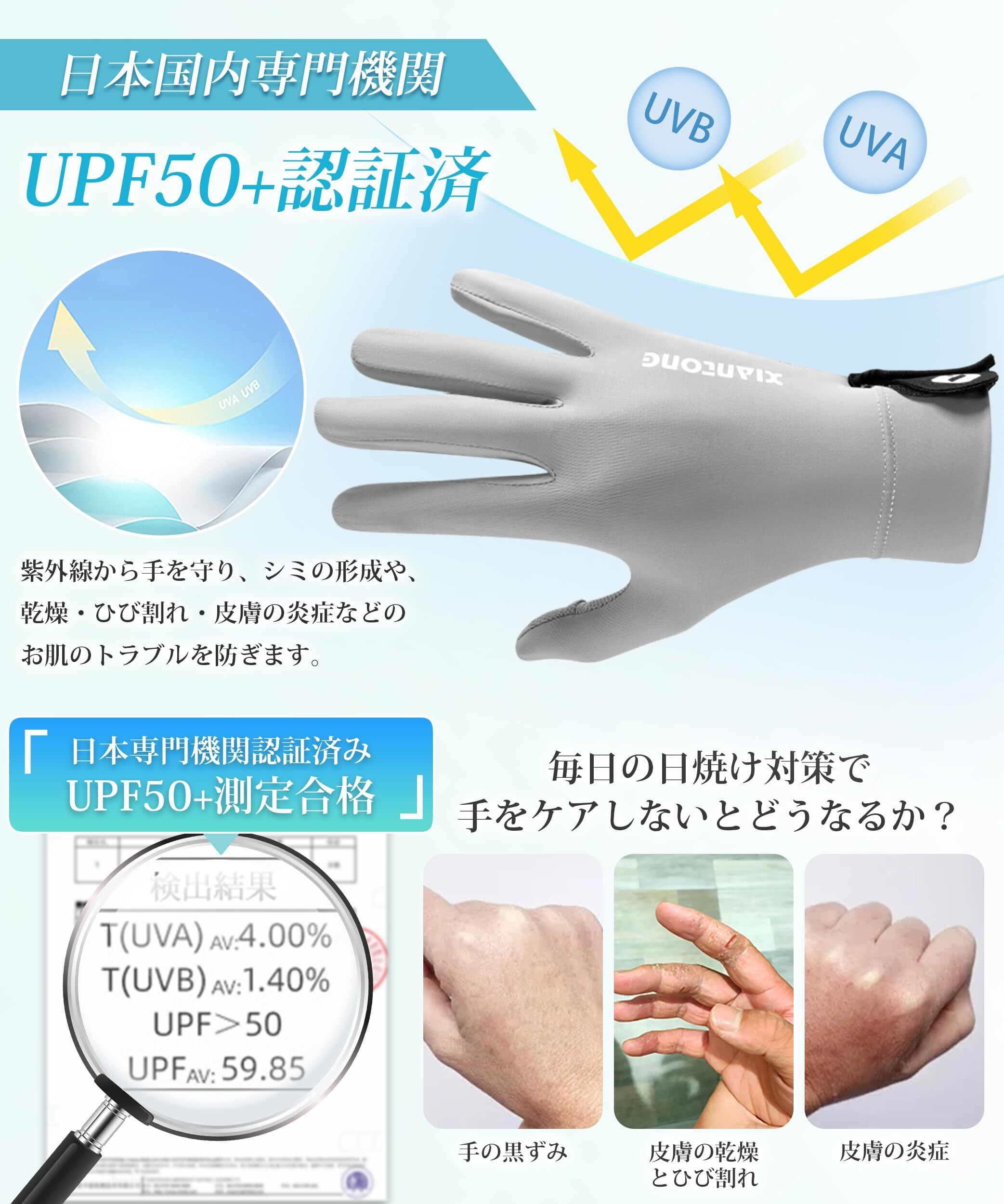【UPF50+・UVカット99%以上】:メンズ 手袋の素材は検査機関のUV遮蔽率測定試験で証明済み。業界最高レベルUPF50+で、UVAとUVBの紫外線を99%以上カットします。日灼けしやすい手(シミ・シワなどの光老化)を保護できます。お肌にとって有害となる紫外線をカット、肌をすっぽりと隠して、高いUVカット率を発揮するメンズ手袋です!肌から熱を吸い取ってくれる吸熱性と熱を外に放出する放熱性が優れているため、暑い日も快適に過ごせます。サッと着けるだけで、紫外線から日灼けしやすい手を保護できます。UVカット手袋、日焼け止め手袋、夏の暑い日の日焼け防止に非常に効果的!