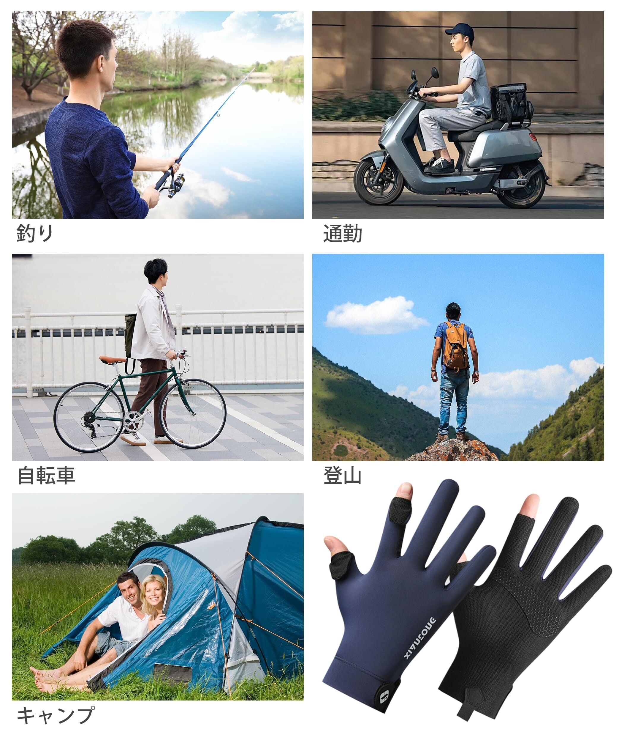 ・特徴:接触冷感素材を採用しているため、手元を涼しく保つことができます!滑り止め加工により、しっかりとしたグリップ感で自転車や釣りなどのアクティビティにも最適。さらに、スマホ対応で、手袋を着用したままでも快適に操作できるのが特長です。